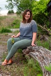 This tee is intended to be worn with 2-6” / 5-15 cm of positive ease. Select a size 2-6” / 5-15 cm larger than your chest circumference. Measurements below are for the fin- ished garment after blocking. Samantha wears size 4 with +2.25 / 5.5 cm of positive ease and is 5’6” / 167.5 cm tall.