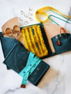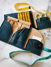 As written, the finished books will be about 4.5 inches tall, 2.5 inches across when closed, and 7.5 inches across when opened (the original and the one with the pocket) or 5.5 inches tall, 3.5 inches across when closed, and 7 inches across when open (the extra large one). I find that’s plenty big enough to hold scissors, cable needles, a tiny crochet hook, a darning needle, and a tiny pen and bit of paper for notes. But you can absolutely play with the scale of the template to make something a bit bigger or smaller if your printer allows for it and you can find material that works for those sizes!