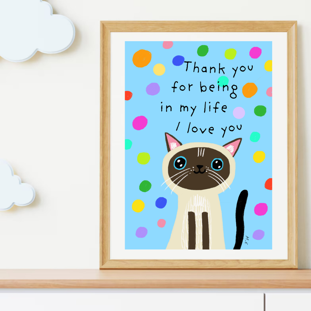 Playful and sweet, this hand-drawn print brings a raw of positivity and cuteness to any space. Looks beautiful in natural wood frames or styled on pastel backgrounds. Ideal as a soulful gift for a tender heart.