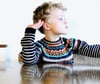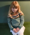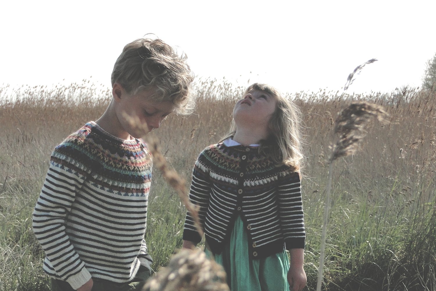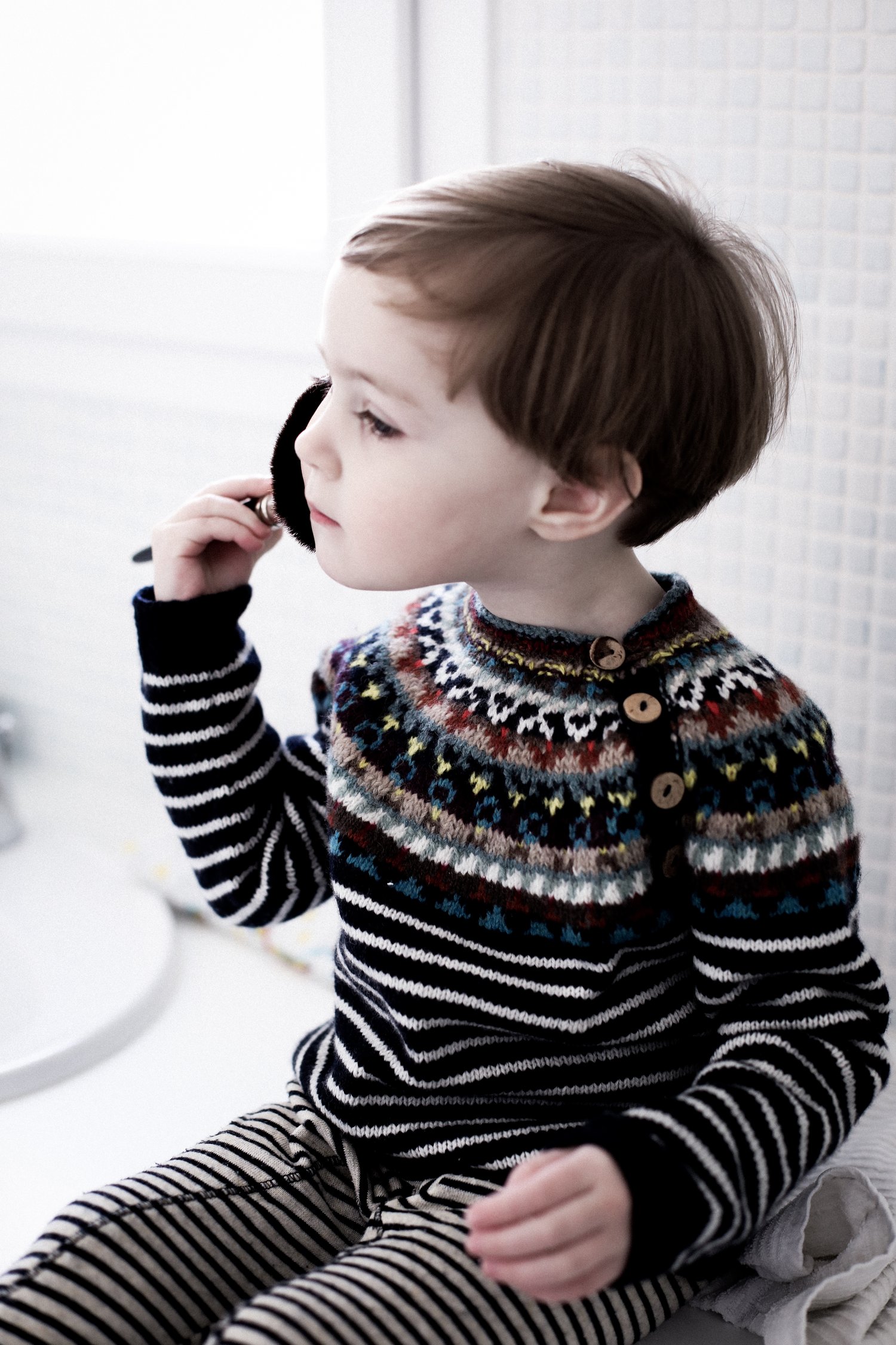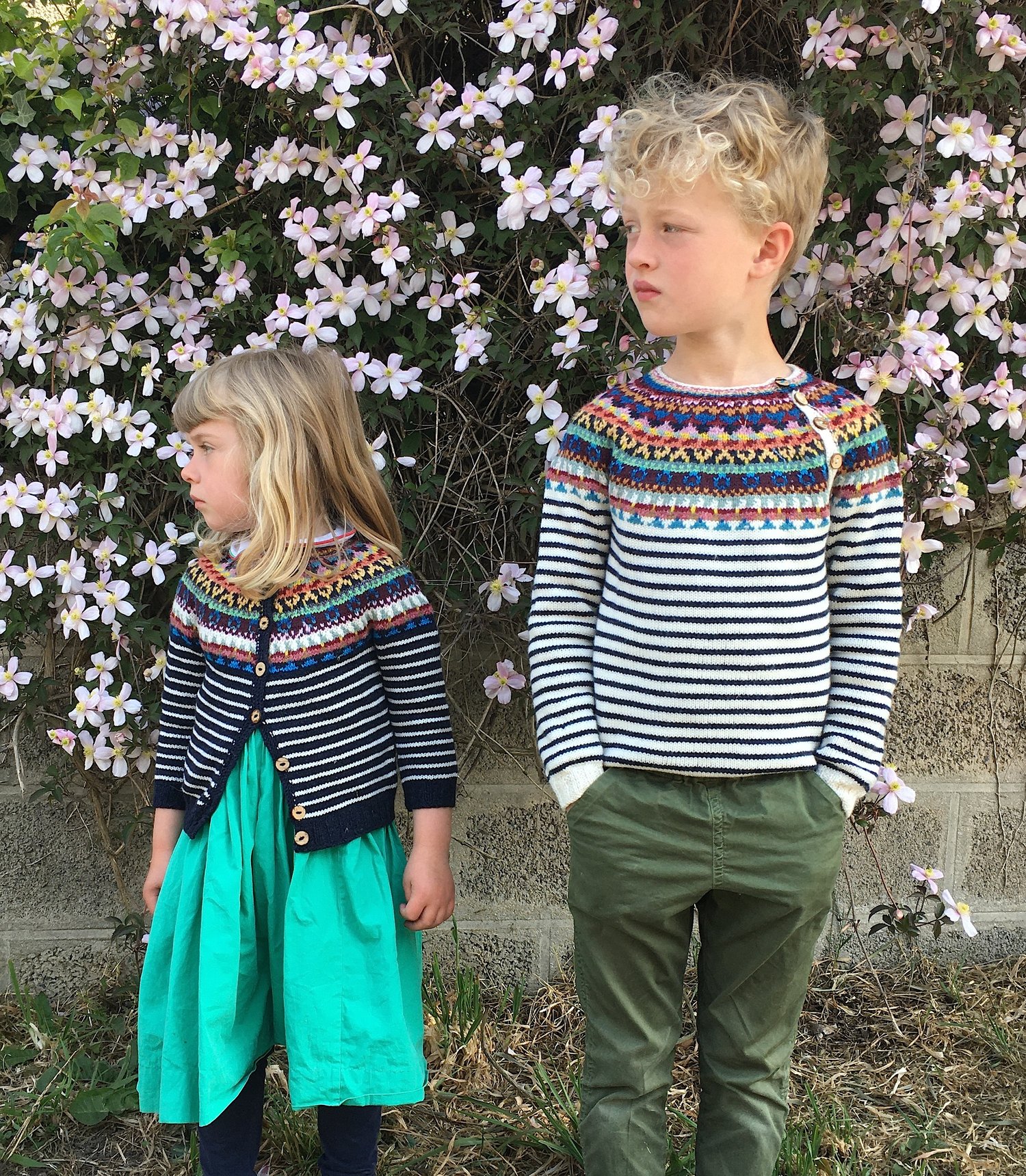 A patchwork of stripes and small peerie Fair Isle motifs is simple but striking and looks great in any mix of leftover yarns from your yarn basket, so you don’t have to think too much about it! The striped body and sleeves are knitted in the round from the bottom up, in stocking stitch. After putting a few stitches on hold at the underarm, the sleeves and body are then joined to work the yoke in one piece. As well as being a nice detail, a side button band makes it easy and comfortable to get on and off.