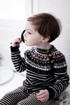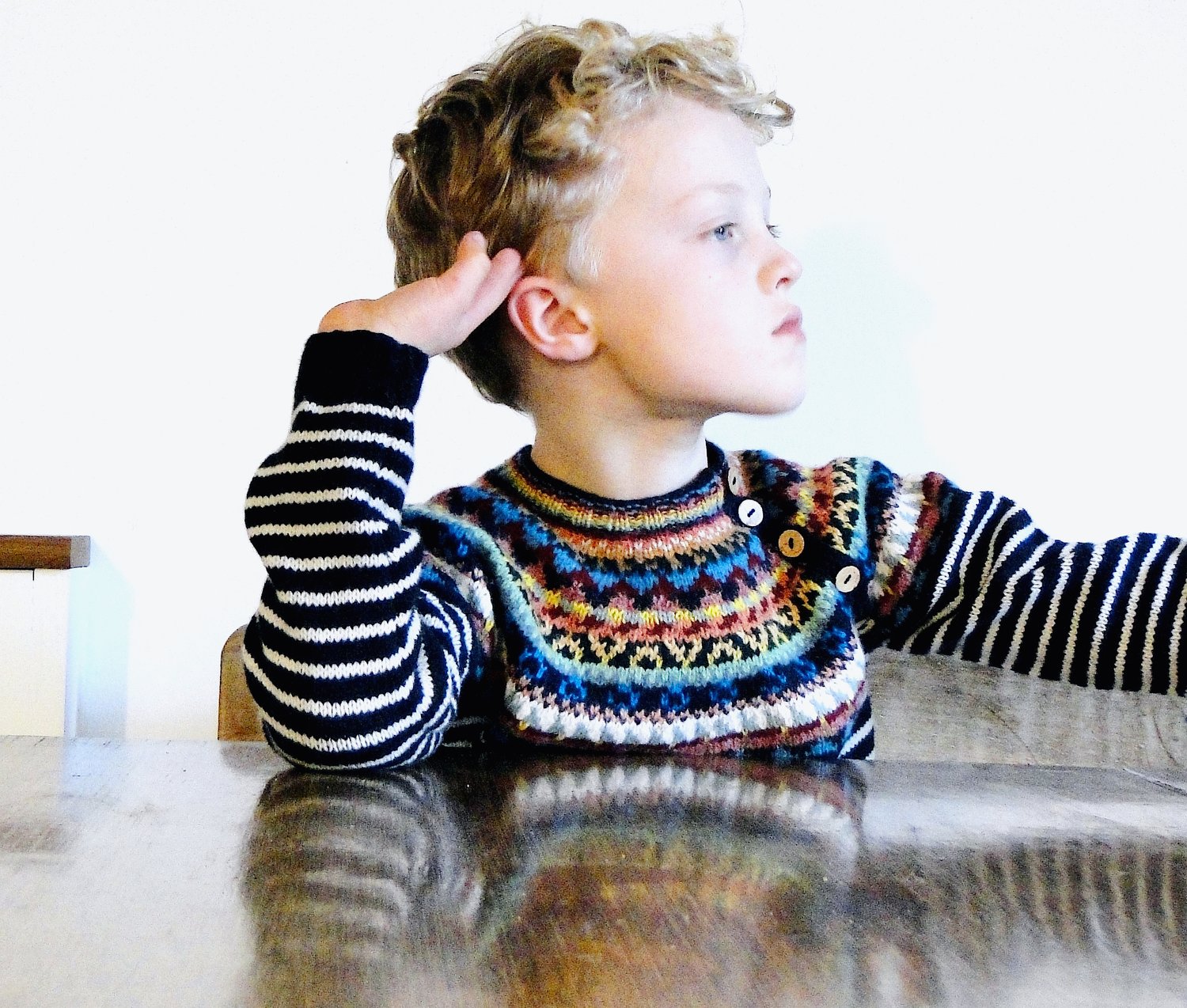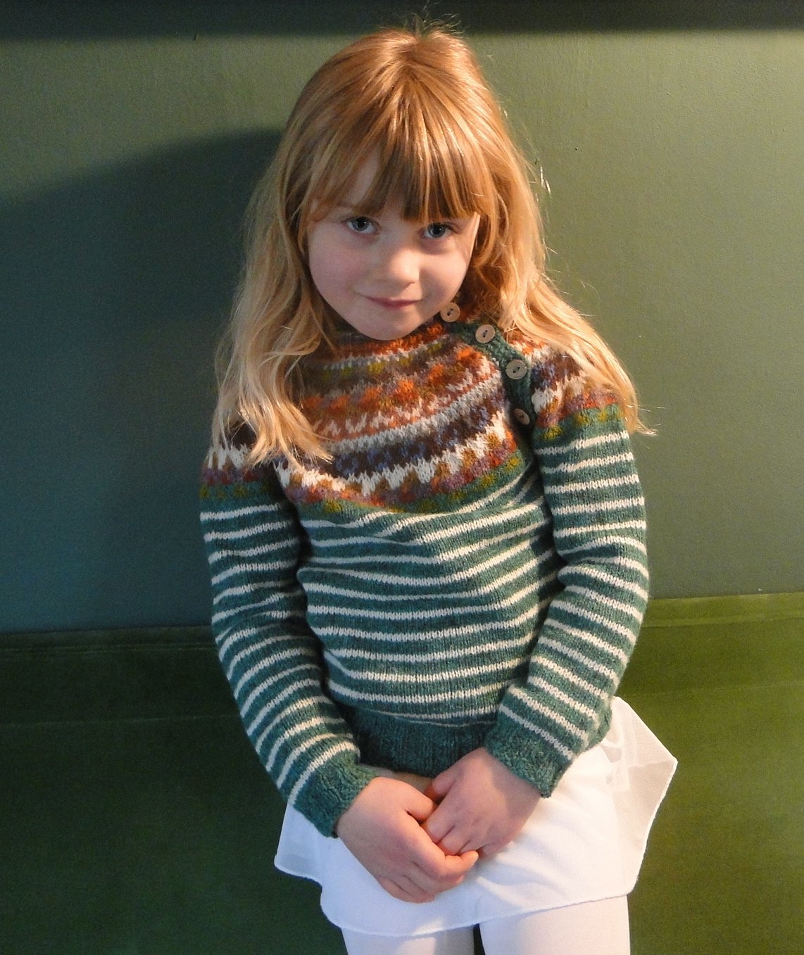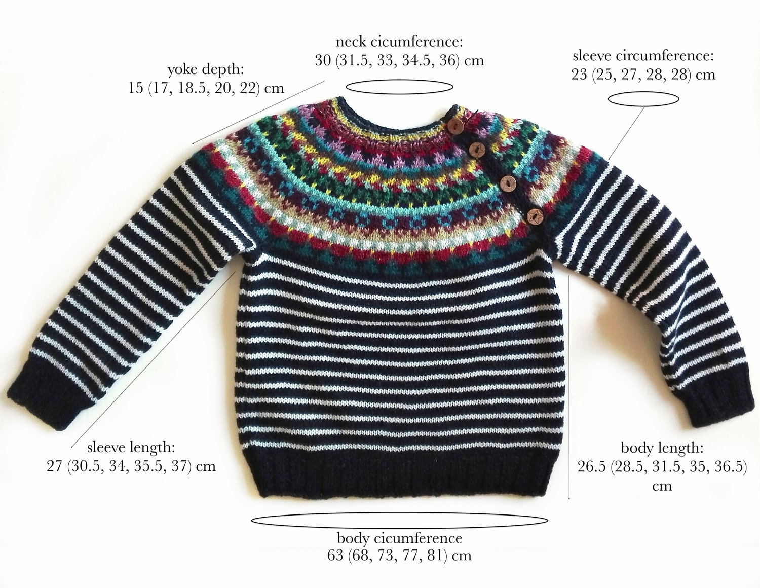 On 2.75 mm, in stocking stitch and after washing and blocking: 26 stitches and 36 rounds to 10 x 10 cm (4 x 4 inches). Or use any needles to get gauge, then use two sizes down for the ribbing. On the same needles: 26 stitches and 28 rounds to 10 x 10 cm (4 x 4 inches) in yoke pattern. Some knitters find their tension varies between the 2 techniques. Therefore, you may wish to changes needles once you start the yoke. It’s always best to do a test-swatch.