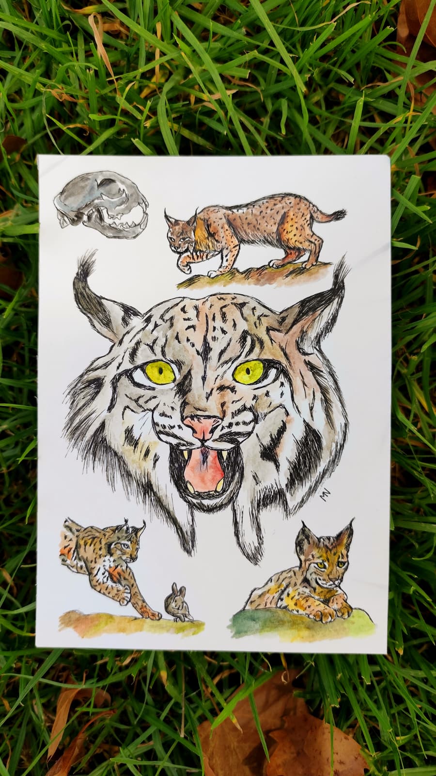 Obra en acuarela y delineador negro que representa al lince ibérico, uno de los animales más emblemáticos de España y de Europa. En la pieza se combinan diferentes perspectivas de este fascinante felino: el majestuoso adulto, la delicadeza de su cría, la fuerza en pleno momento de caza y la sutileza de su cráneo, símbolo de su poder natural.