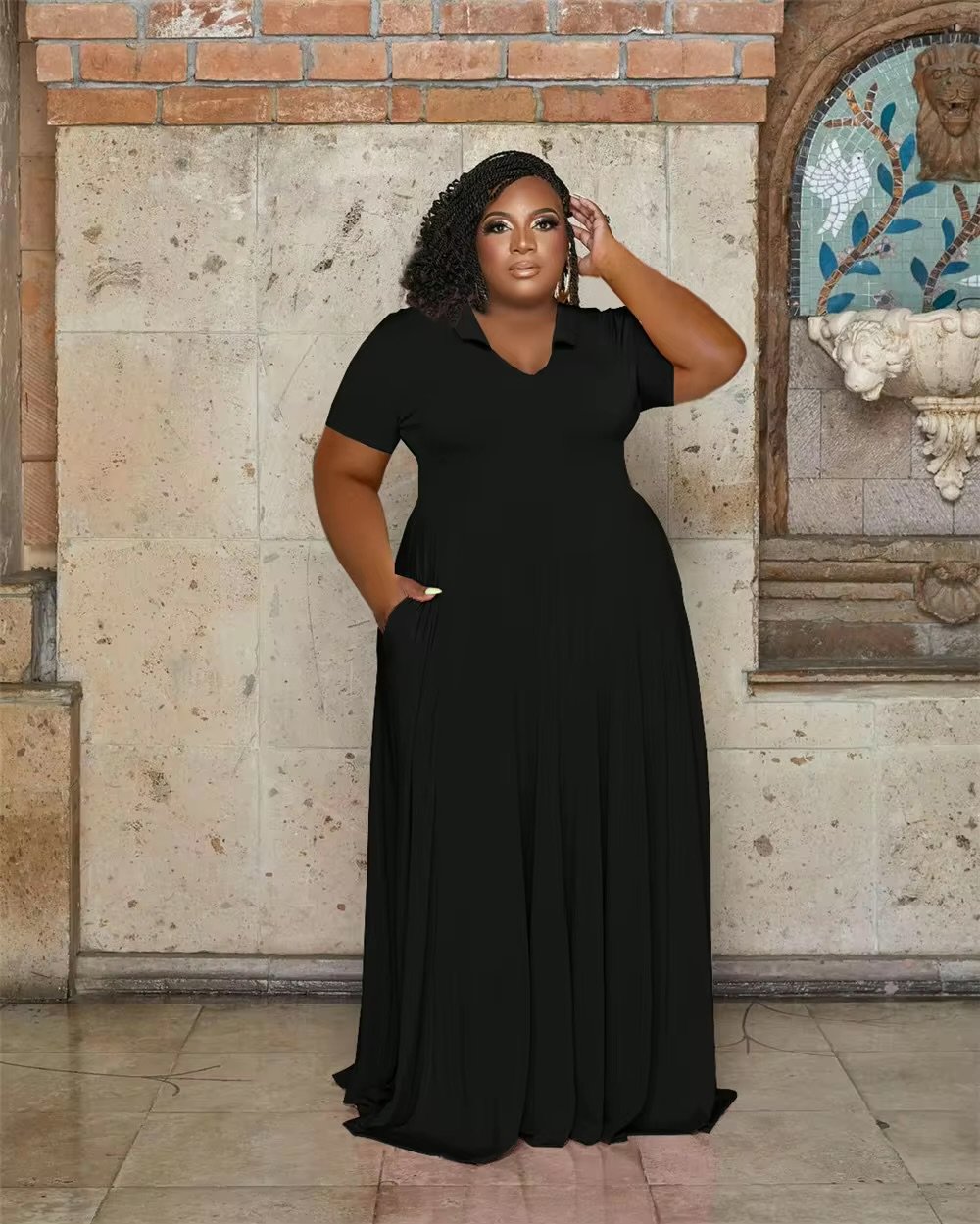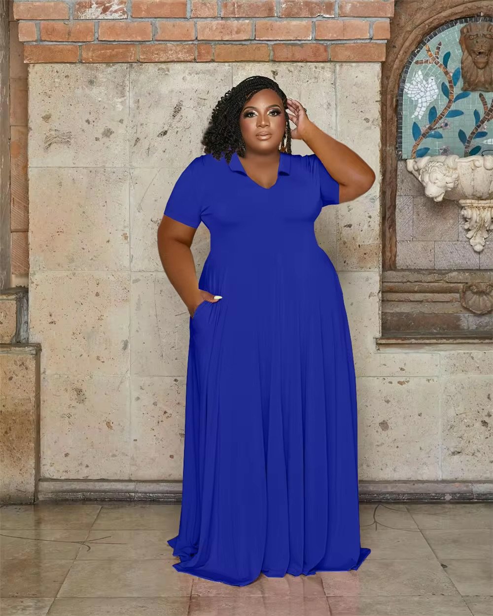 Loose Casual Dresses Summer Turn-Down Collar Short Sleeve Maxi Dress for Women knitting, spandex/polyester V-neck.