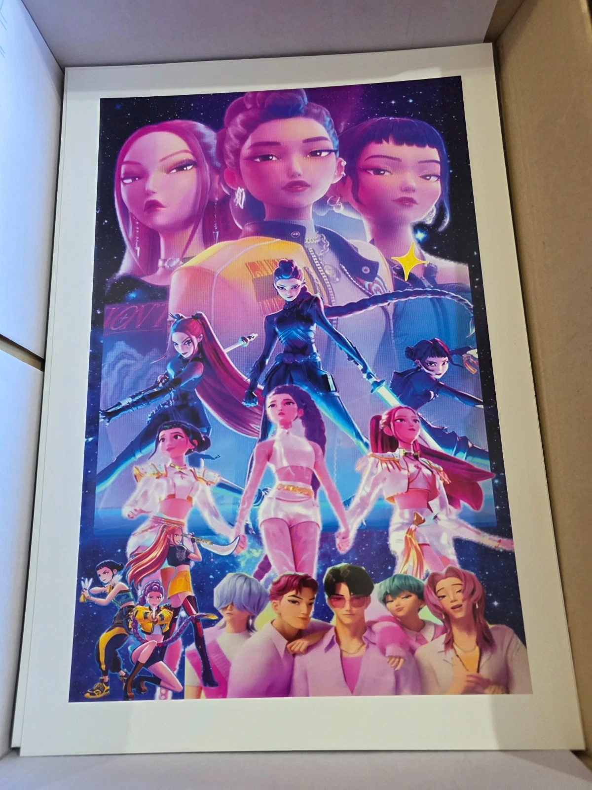 This eye-catching print showcases the fierce girl group HUNTR/X alongside the charismatic Saja Boys, both central to the action-packed Netflix animated film. Inspired by the looks and energy of real K-pop groups like BTS, BLACKPINK, and Stray Kids, this poster captures the style, intensity, and world-building that fans instantly fell in love with.