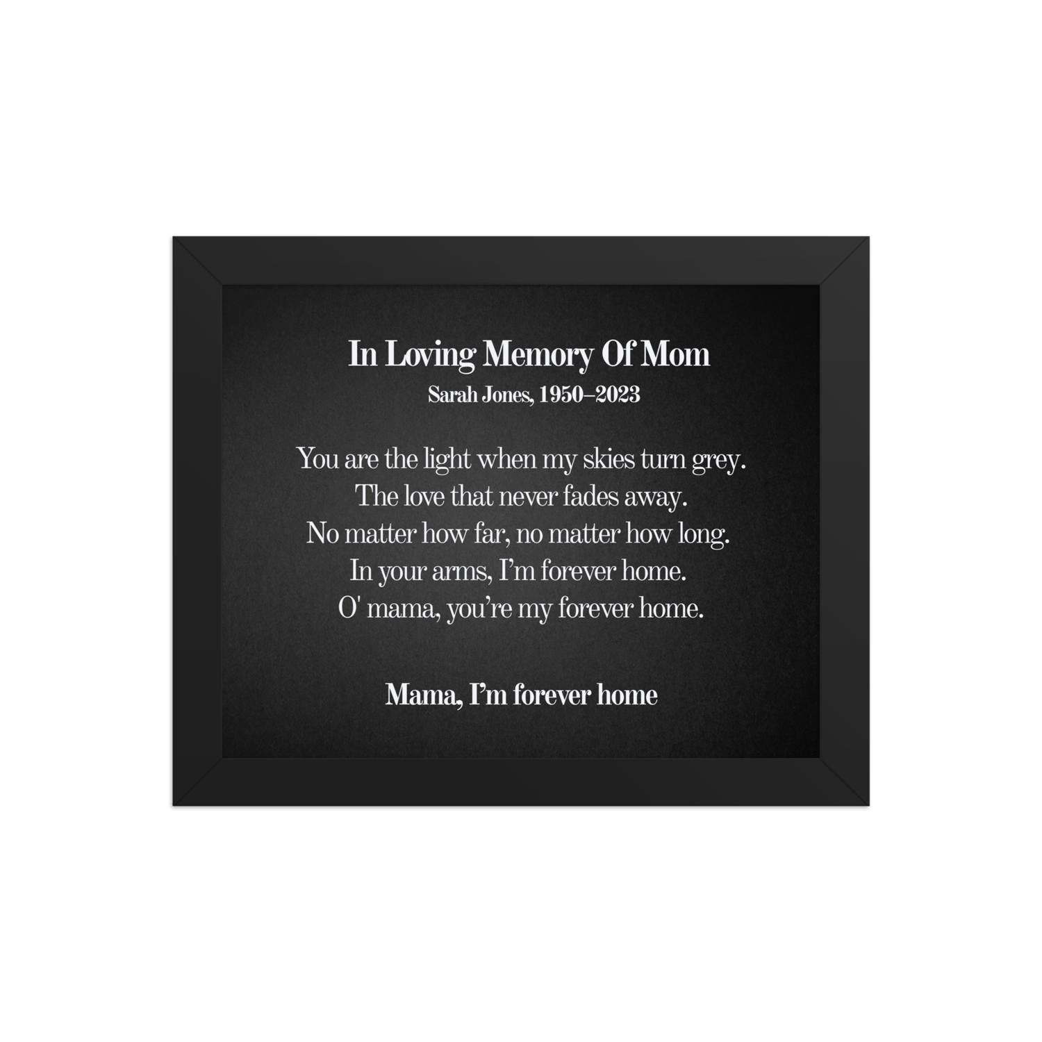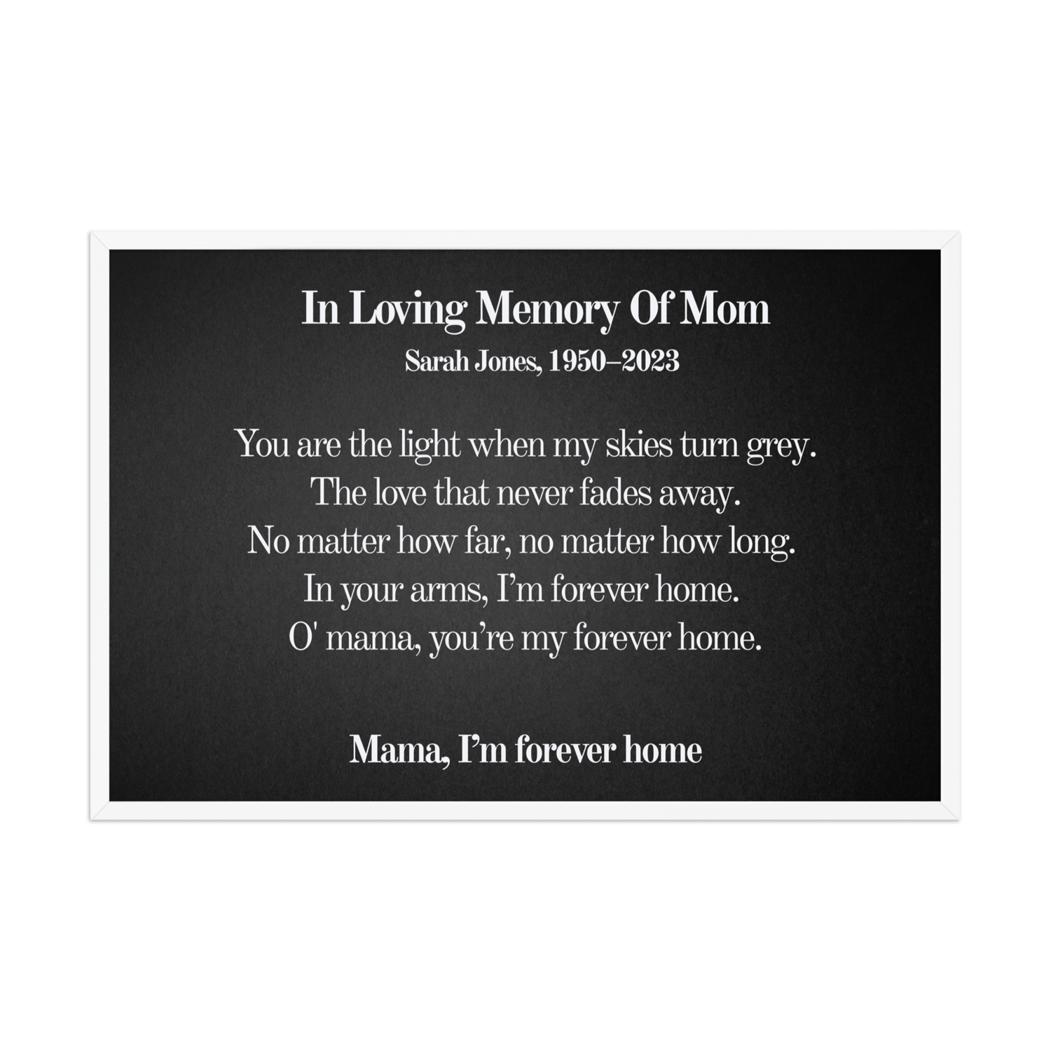 Personalized with your loved one’s name & dates (e.g., Sarah Jones, 1950–2023)