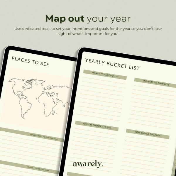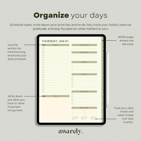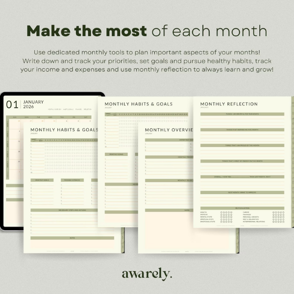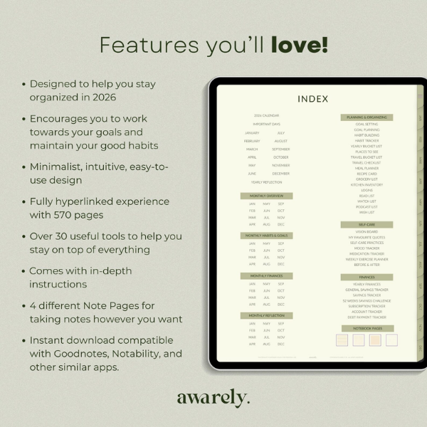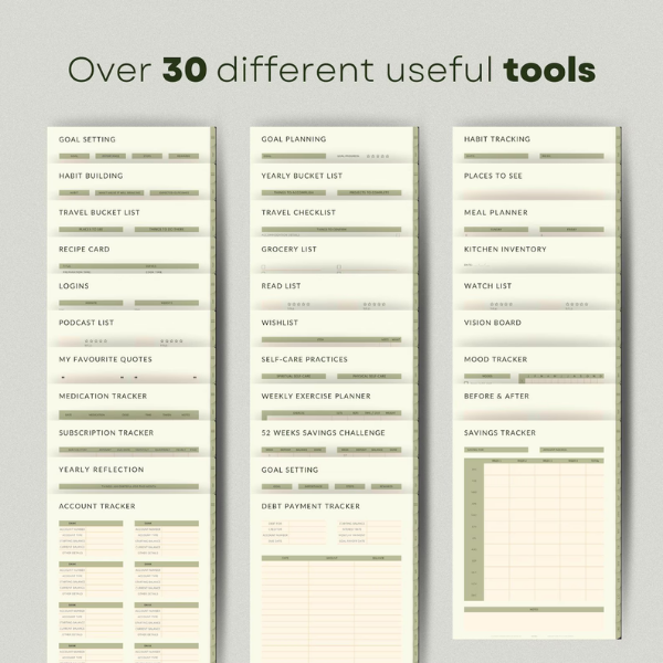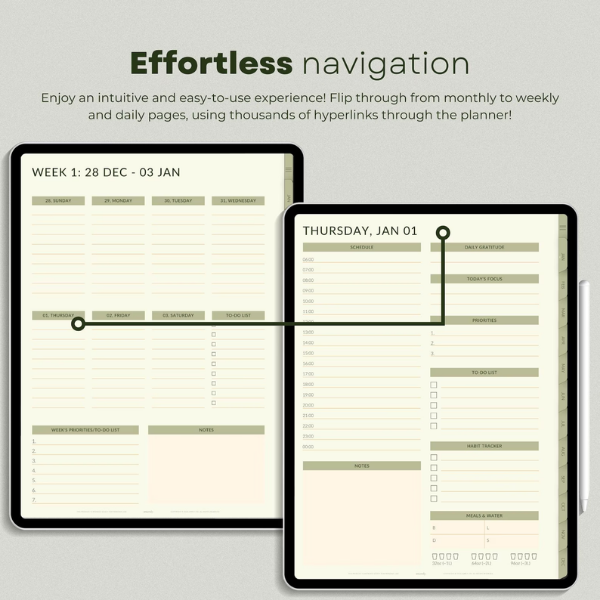 Our 2026 Sage Digital Planner will empower you to take charge of your schedule, focus on achieving your plans and self-growth, and help you design your ideal life. The intuitive layout allows for planning, organizing, tracking and also reflection.