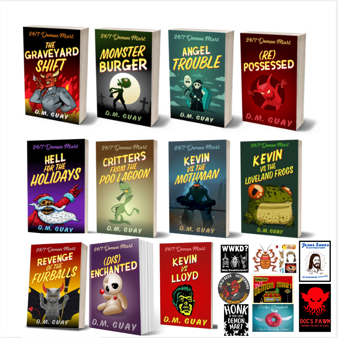 - One copy each of The Graveyard Shift, Monster Burger, Angel Trouble, (Re)Possessed, Revenge of the Furballs, DisEnchanted, Hell for the Holidays, Critters from the Poo Lagoon, Kevin vs Lloyd, Kevin vs The Mothman, and Kevin vs the Loveland Frogs. (All signed!)