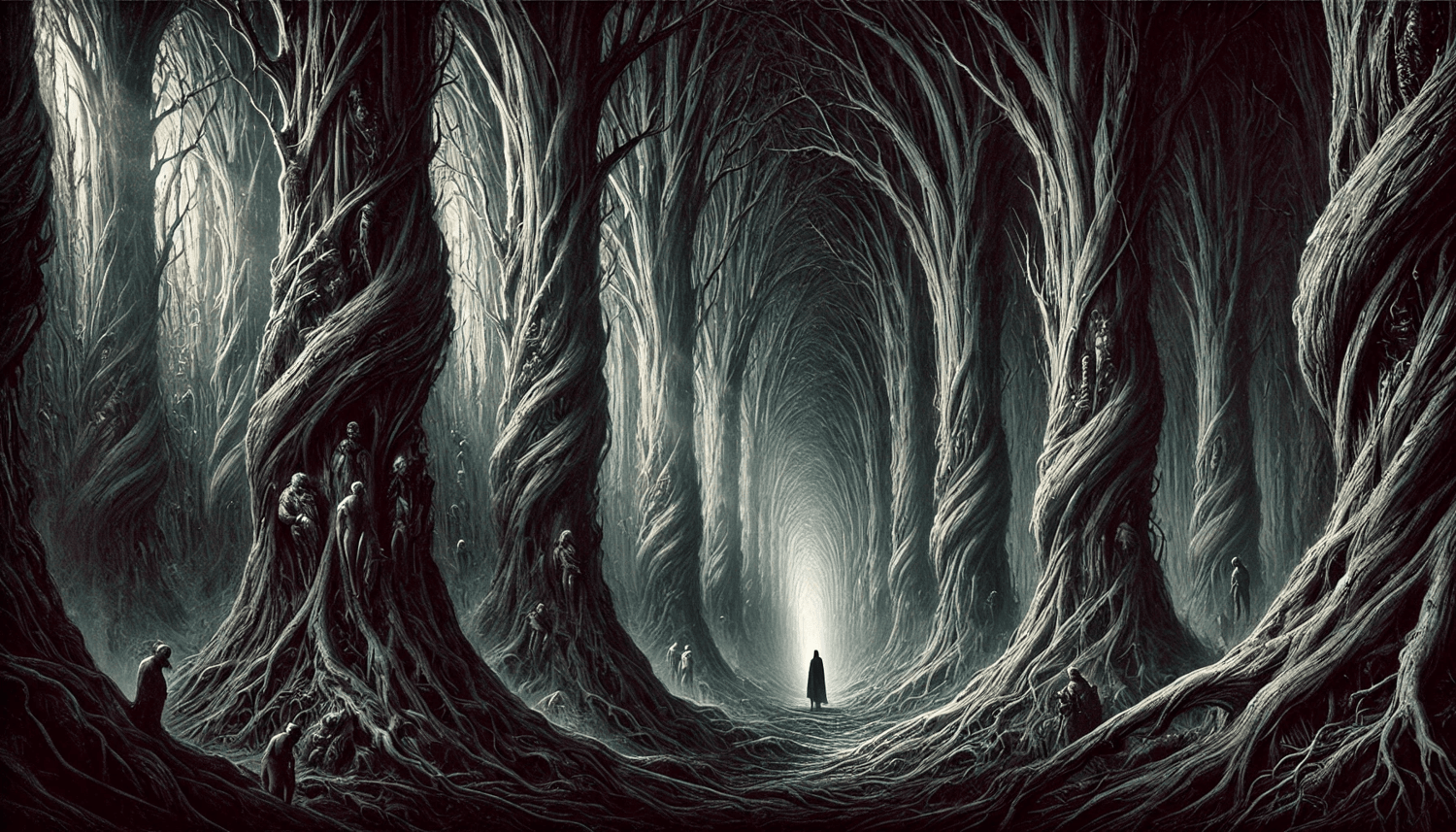 Rendered in a haunting monochrome style, this illustration captures the eerie, oppressive atmosphere of Canto I of Inferno, where Dante loses his way in a shadowy, menacing forest, symbolizing spiritual confusion and the descent into sin.