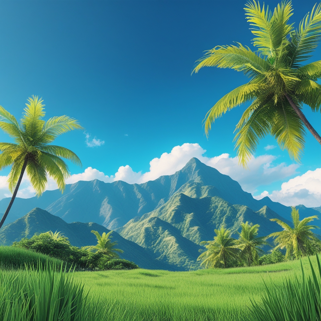 tropical landscape background including mountains, clear blue sky. GREEN GRASS The overall style is modern and bright, the background provides a sense of context and environment. The colors are bright and saturated, an attractive visual presentation for advertising the product.