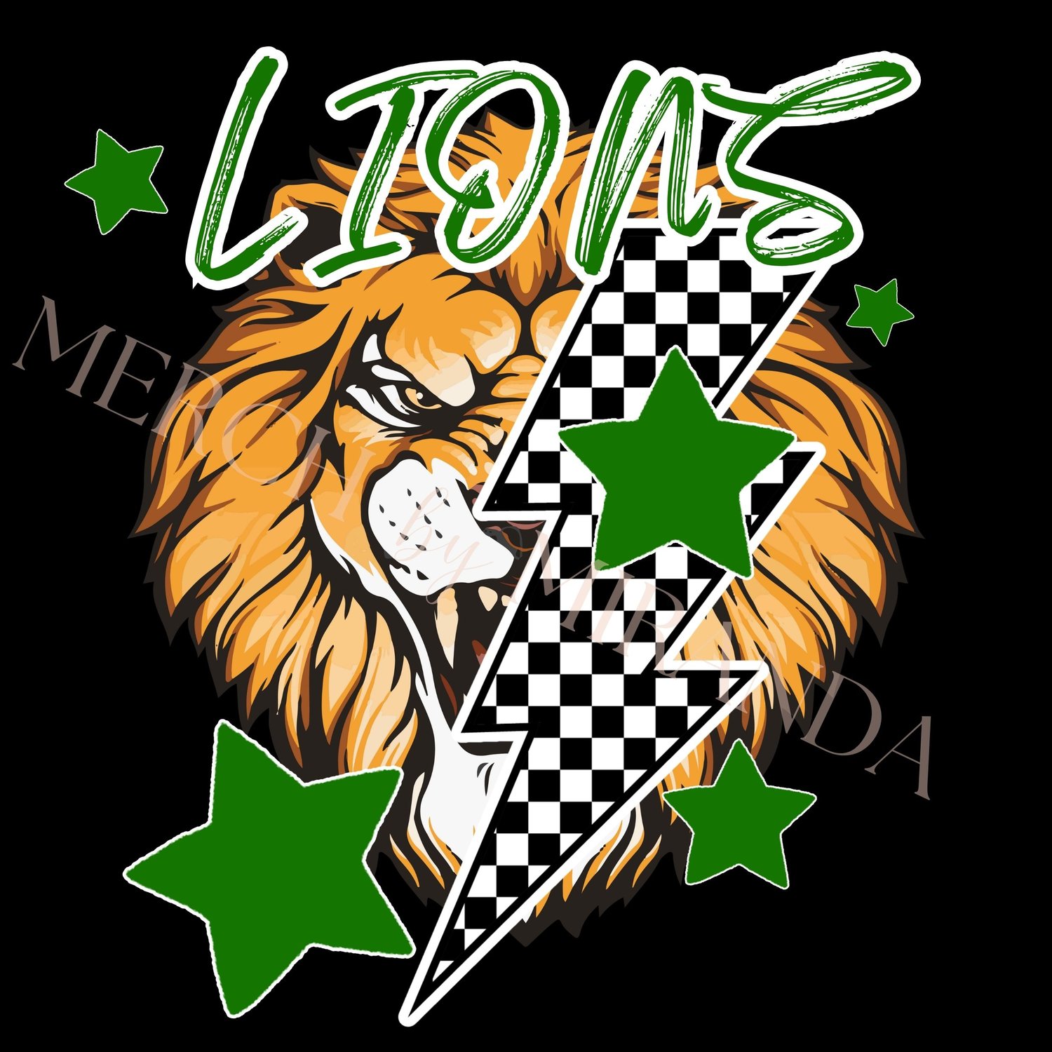 Lion Mascot Green | Sublimation Design | Digital Download | School Spirit Shirt PNG | DTF Design | Lightning Bolt-Checkered with Stars - Lions