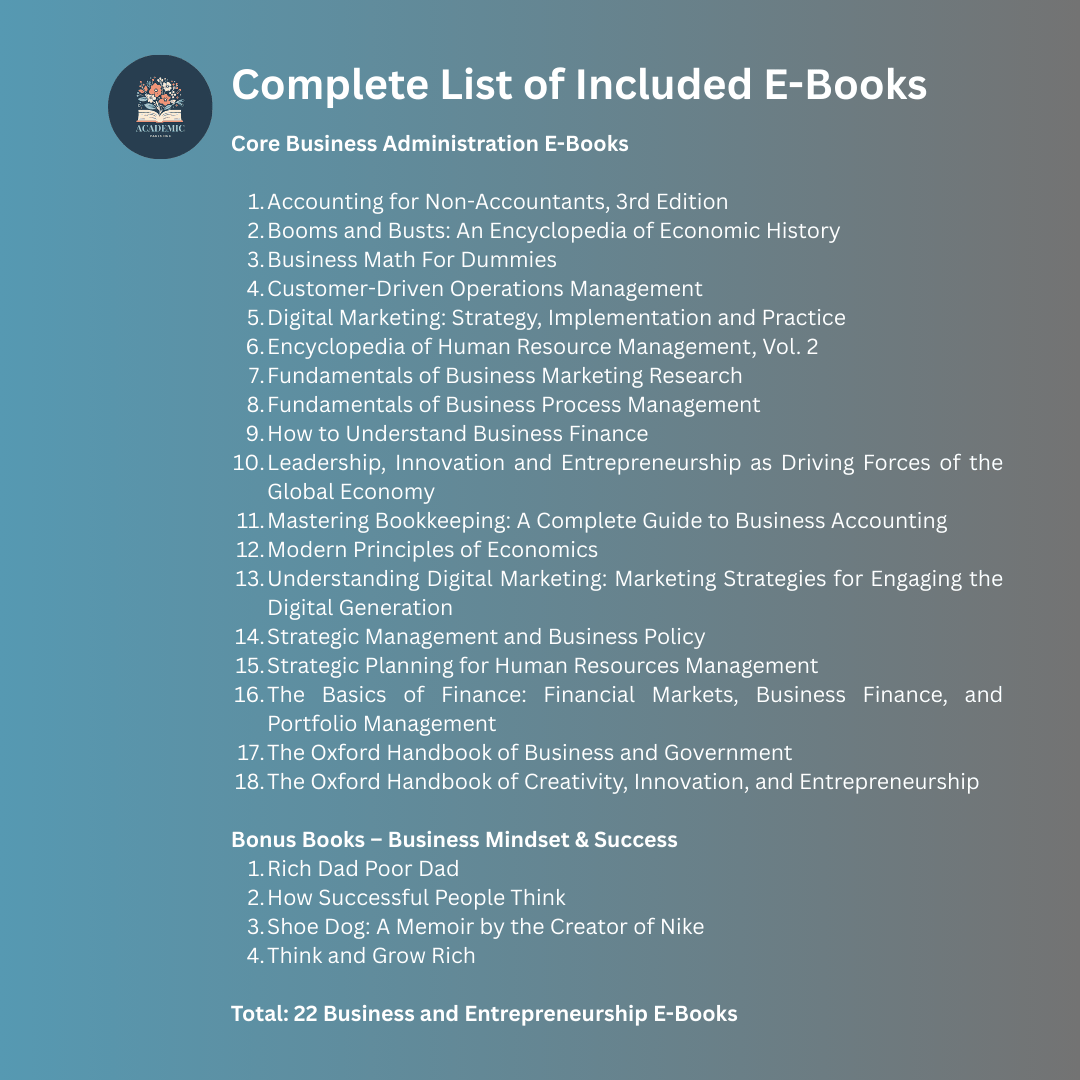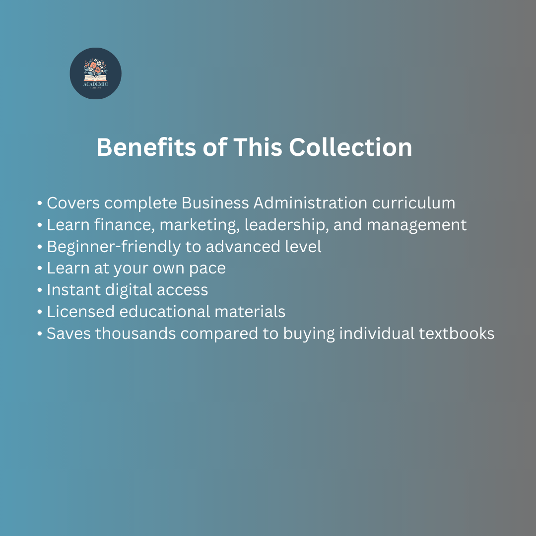 Whether you are a business student, entrepreneur, future manager, or someone who wants to build a successful career in business, this collection provides structured learning materials covering finance, marketing, leadership, human resources, operations, economics, and strategic management.