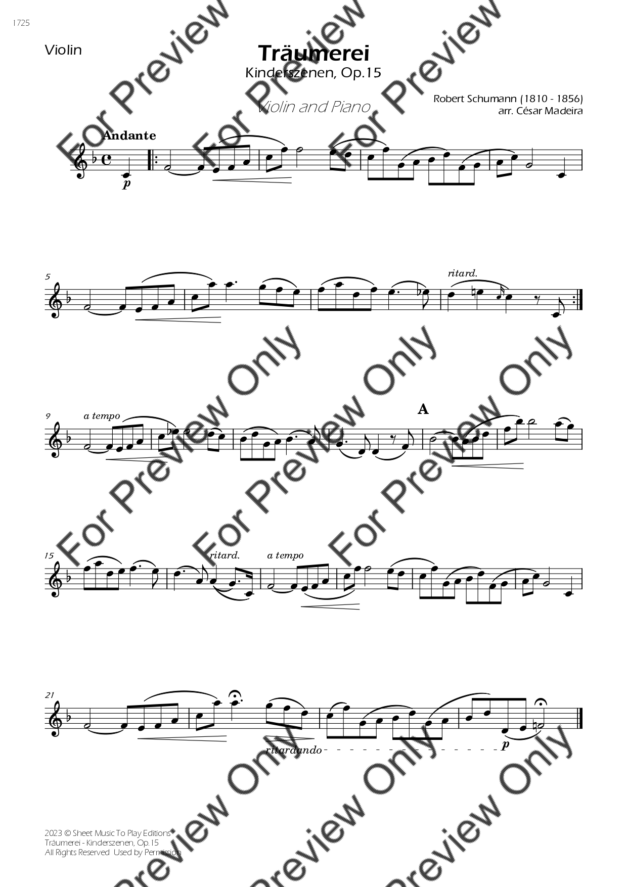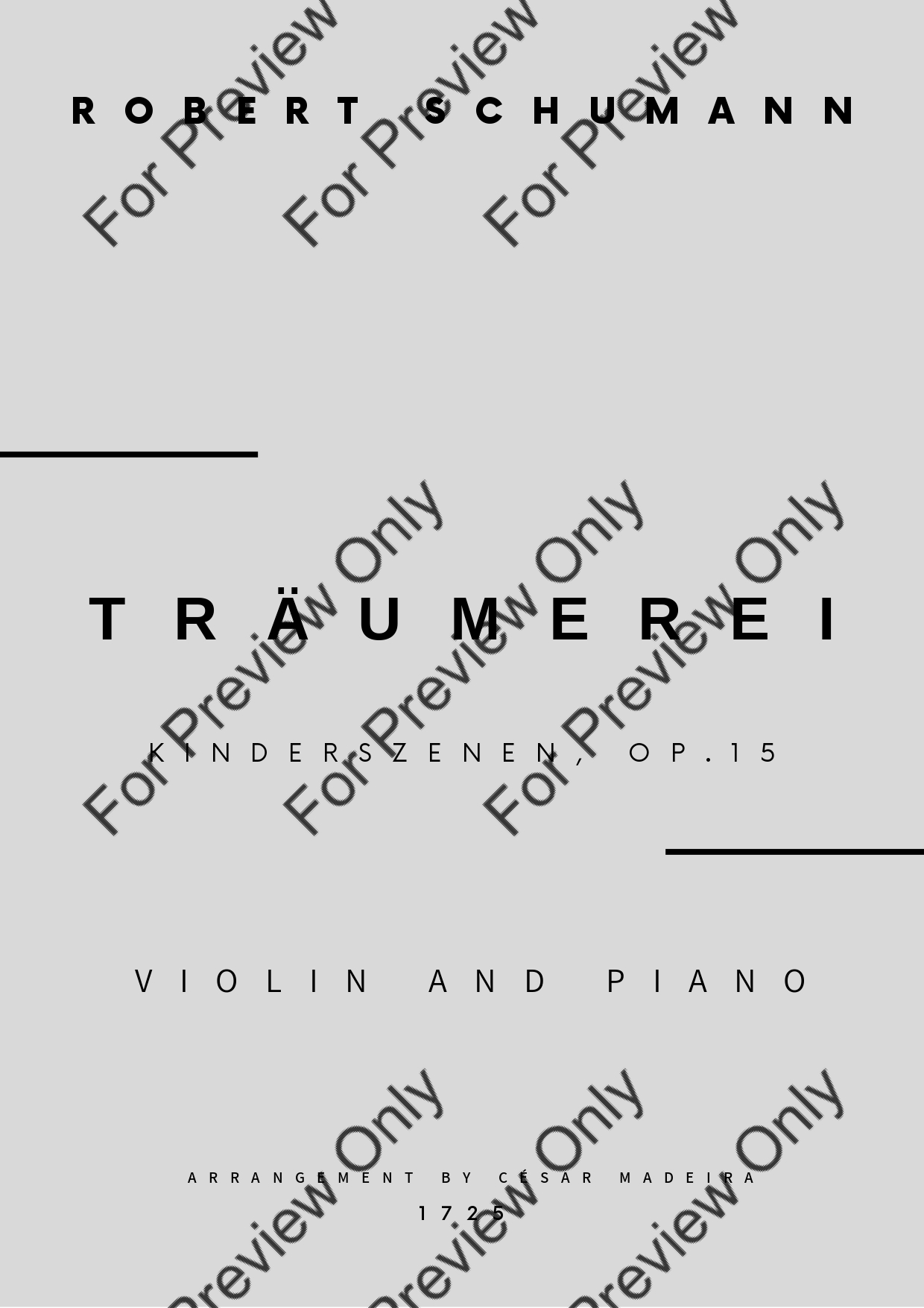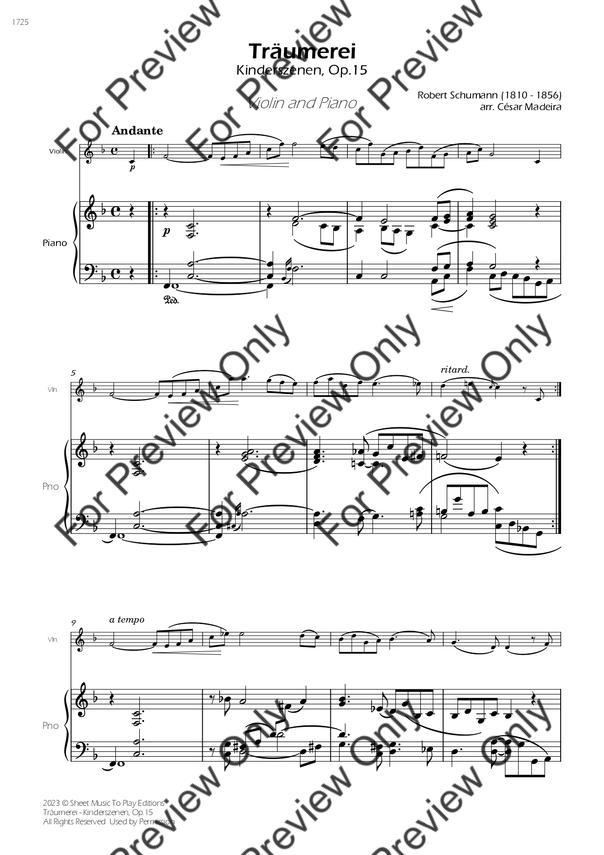 Träumerei from Kinderszenen, Op.15 by Robert Schumann. Arrangement for Violin and Piano. With Full Score and Individual Parts. Have fun!