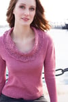 Normally the body of a sweater is knit with the largest needles. In this case, the largest needles and smallest yarn are reserved for the lace cowl, the smallest needles are used for the ribbing, and the medium-sized needles are used for gauge and to knit the body and sleeves of the sweater. Pieces are knit separately from the hem up, shoulders are seamed, and cowl is knit onto the sweater in the round. Then sleeves are sewn on, and sides are seamed.