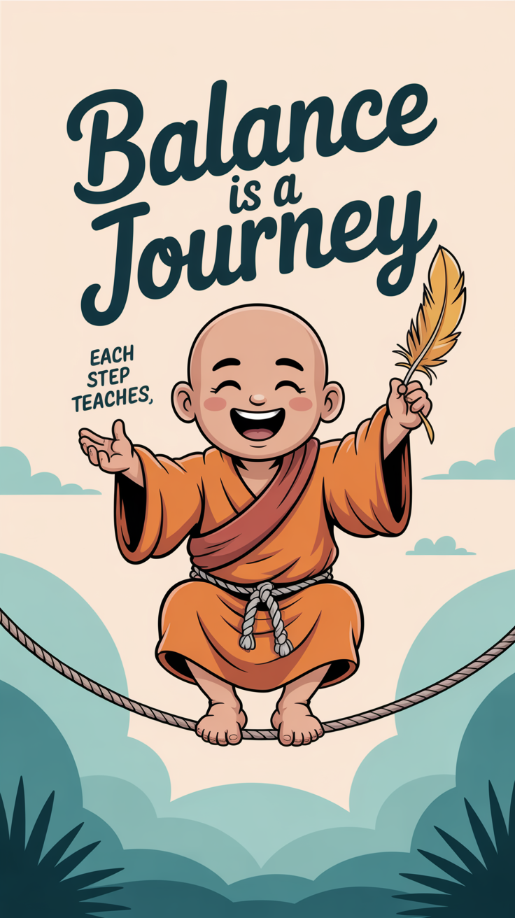 - “Balance is a Journey” – a laughing monk on a surfboard-shaped lotus leaf.