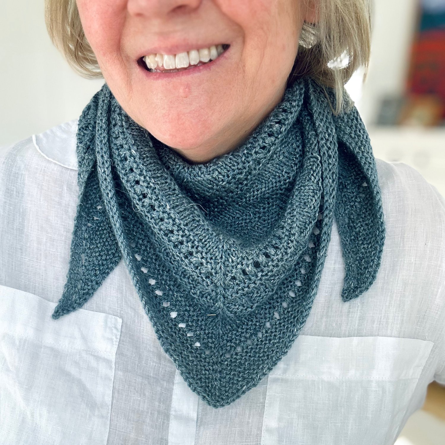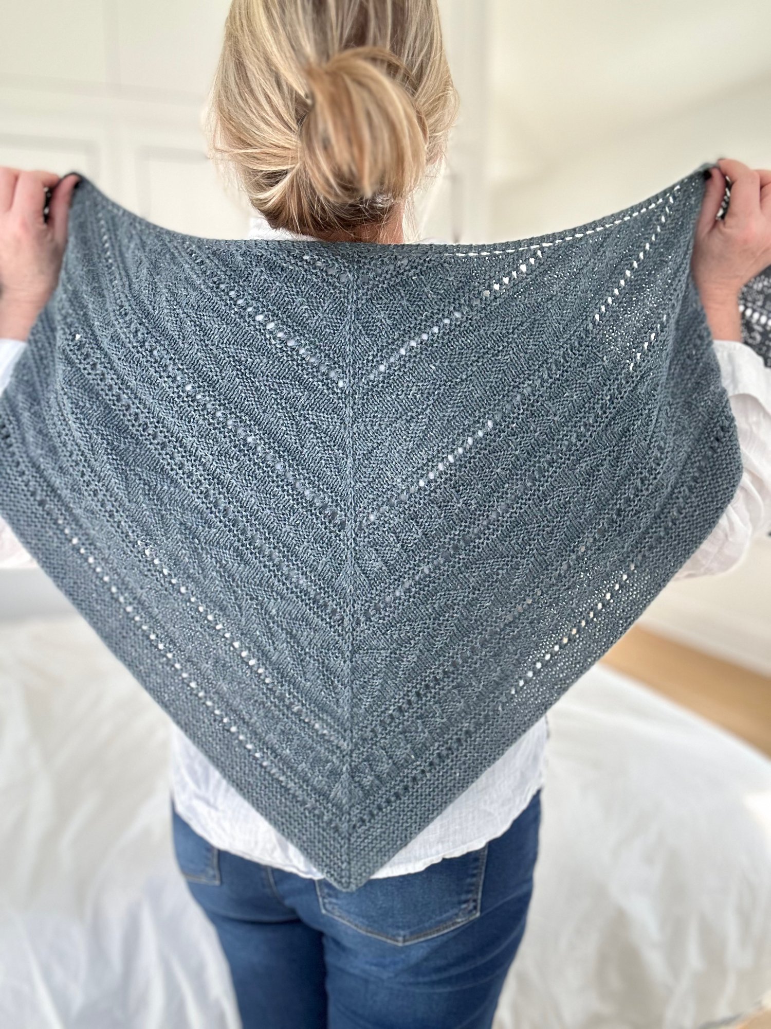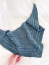 I made 2 further samples of the large and small shawl sizes (both seen here in blue) using The Fibre Company’s Meadow (held double) resulting in a DK weight, which gives you more modest shawl and shawlette sizes.