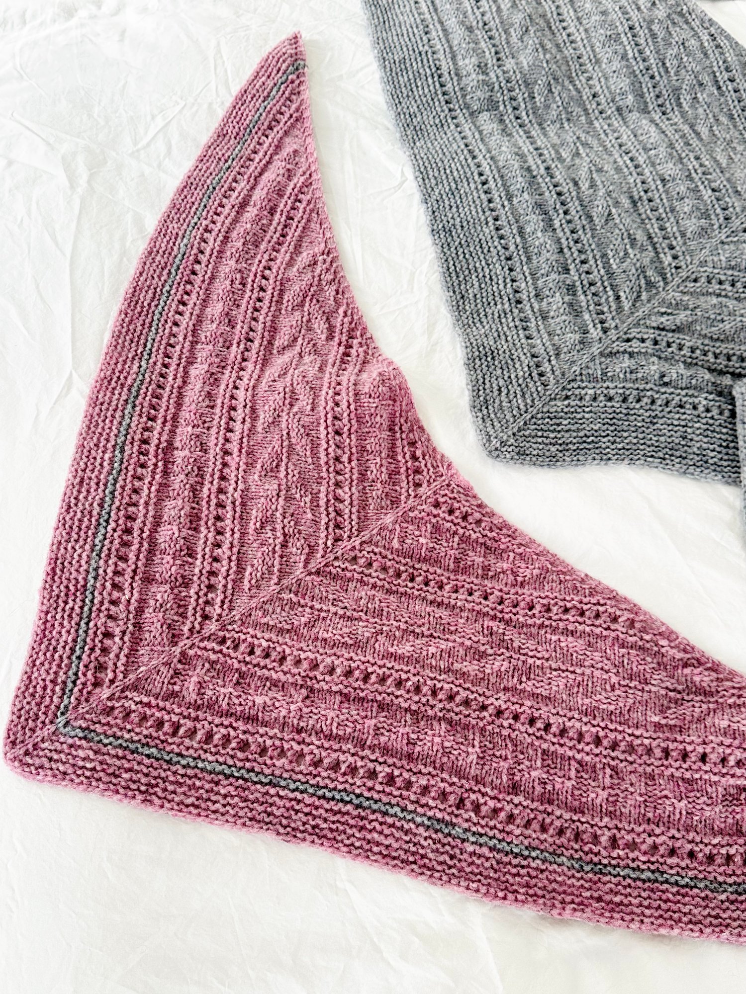 Seashore Hug, is shown here in 2 sizes, large (grey) and small (pink) using Wooldreamers Manchelopis yarn. The different sizes are achieved by repeating the stitch patterns alternately, as often as you like.