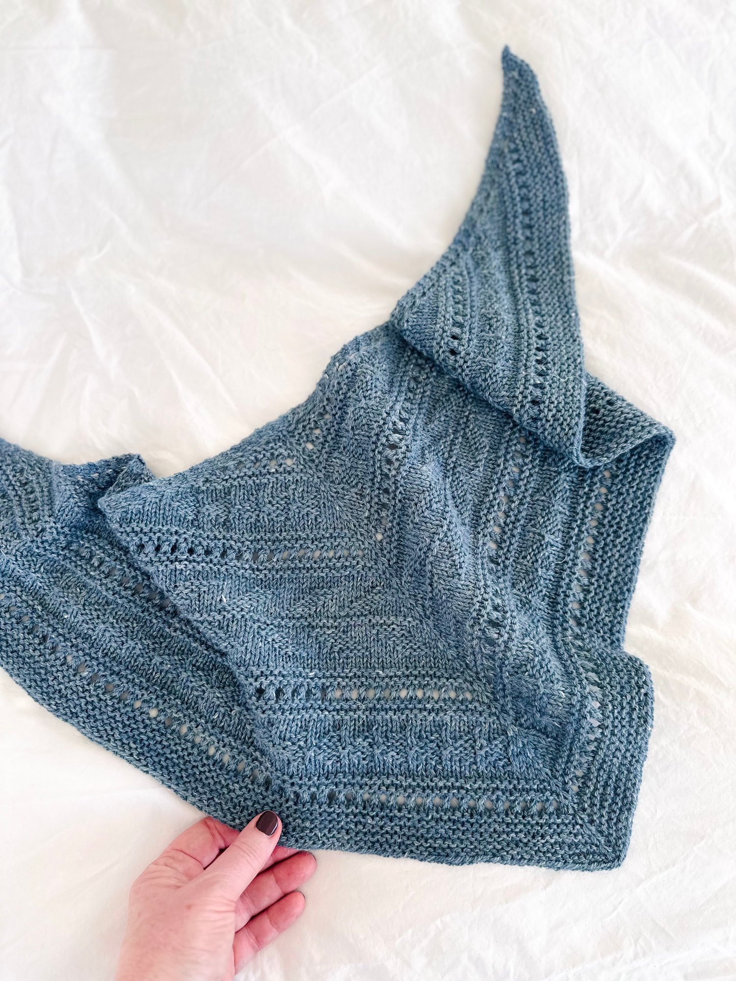 Finished shawl measurements are taken with relaxed fabric after blocking.