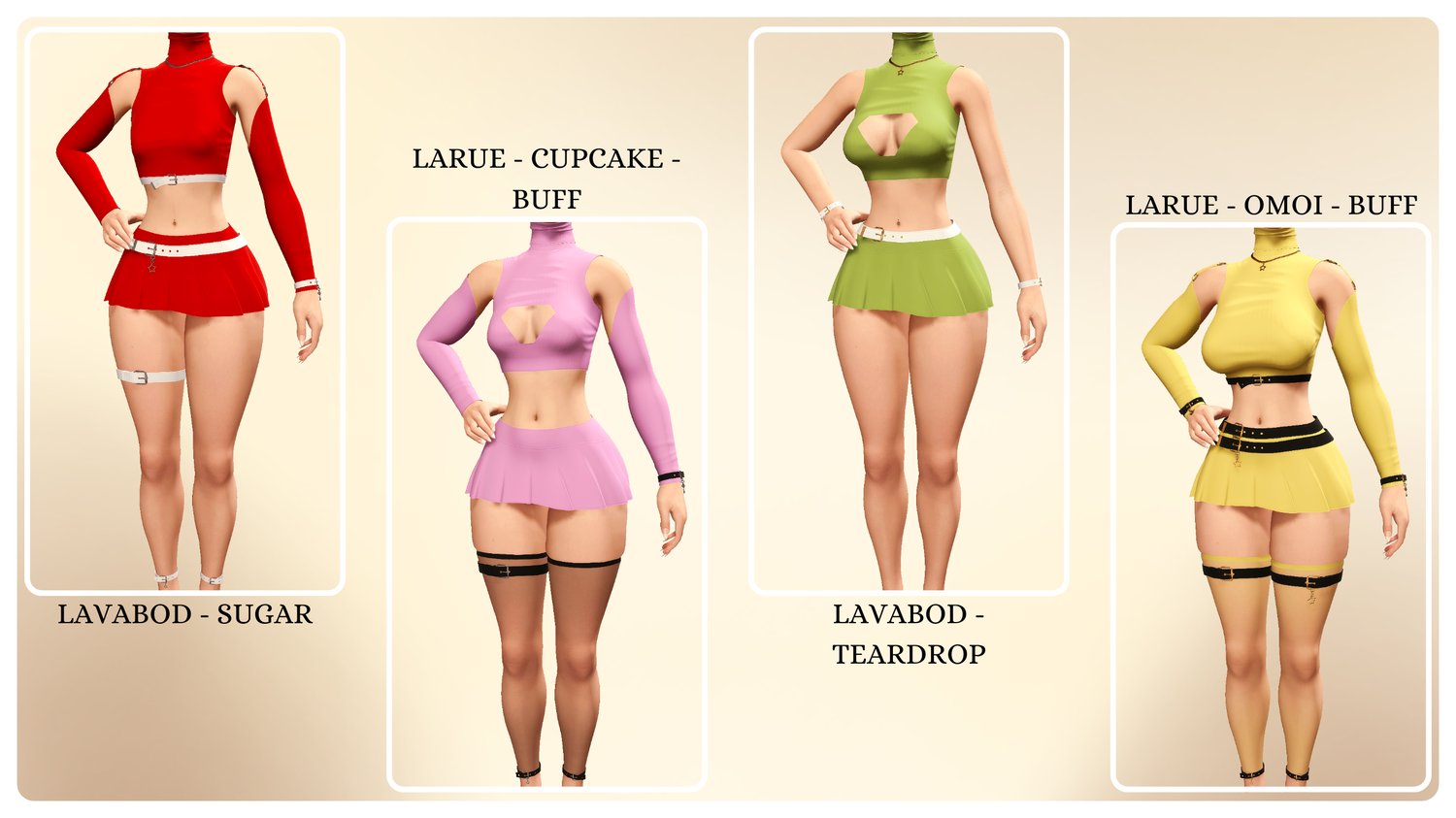 everything toggleable expect for the base clothing (skirt and turtleneck)
