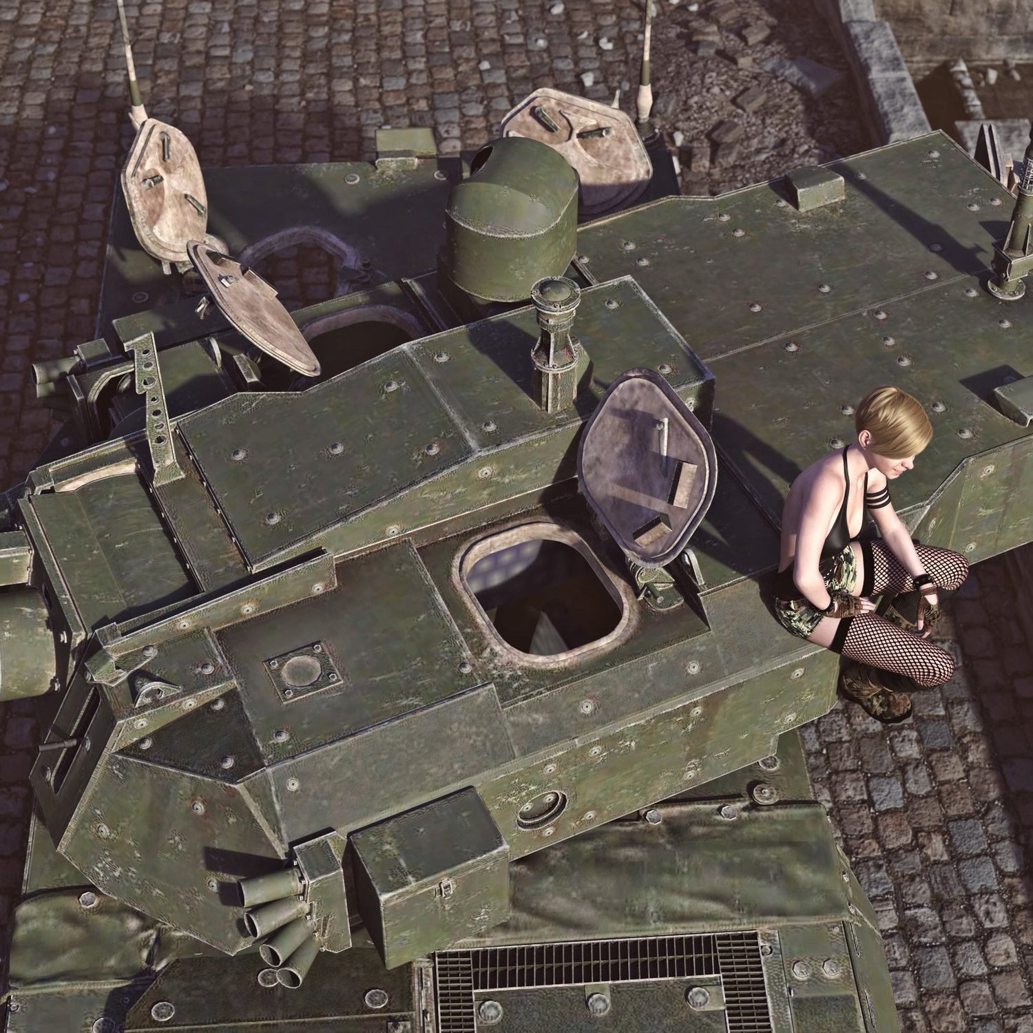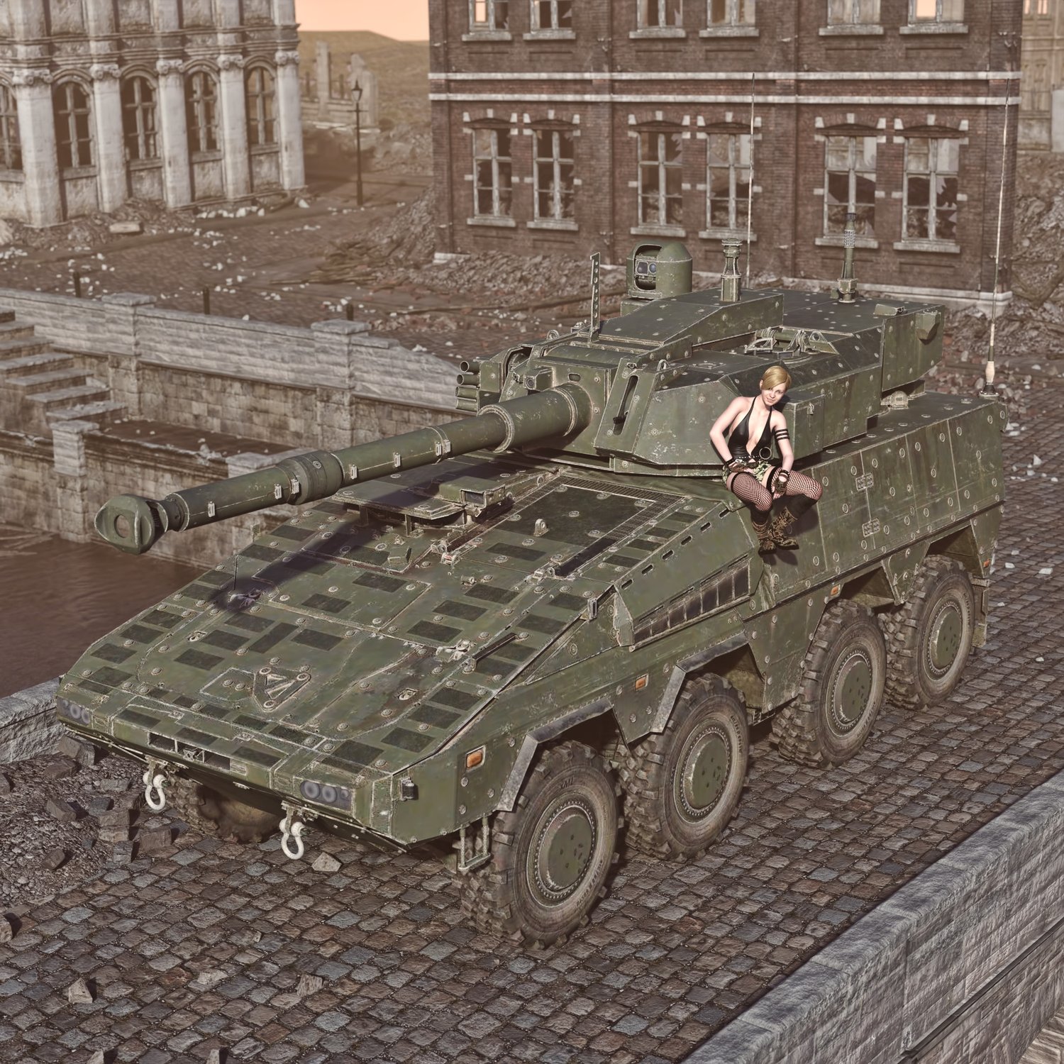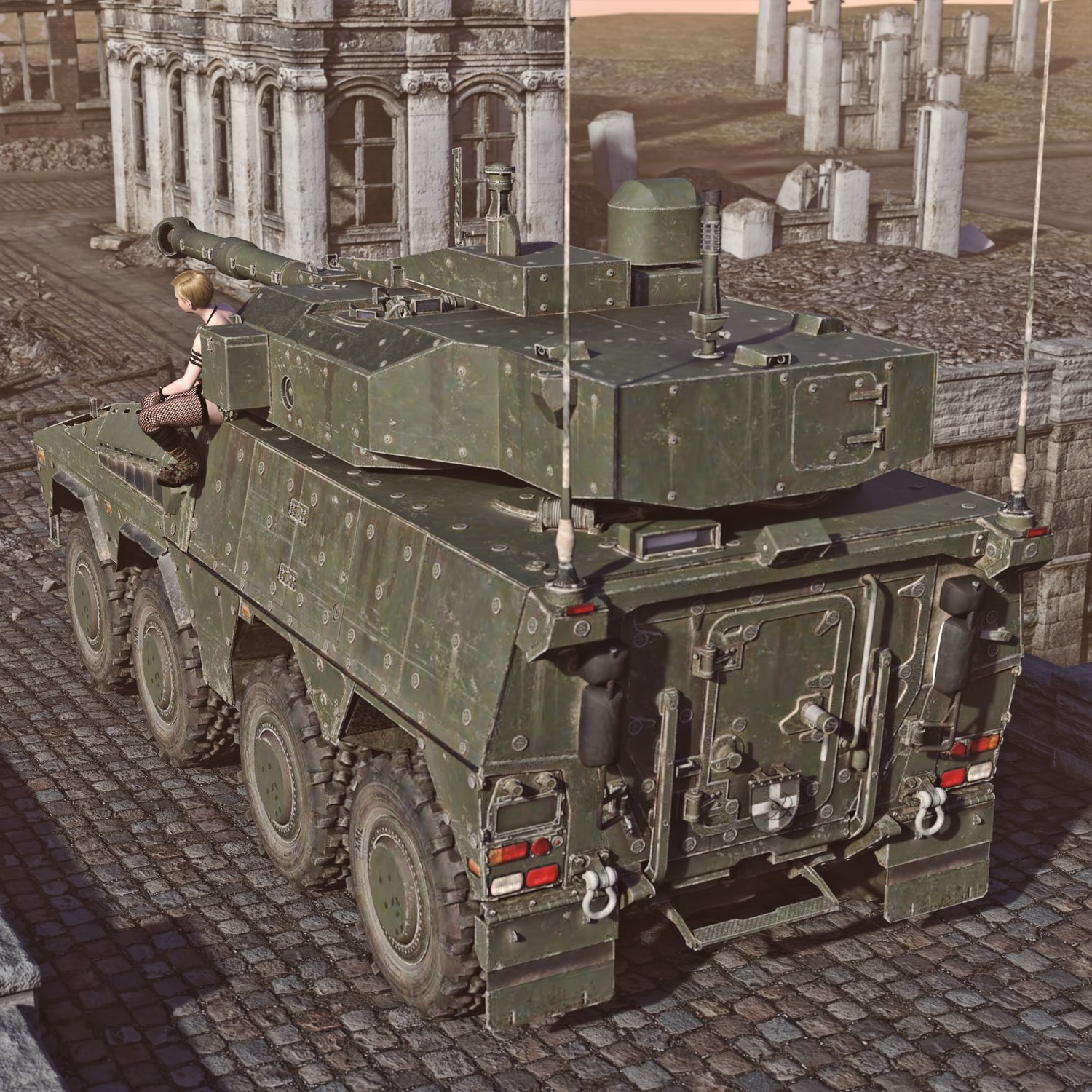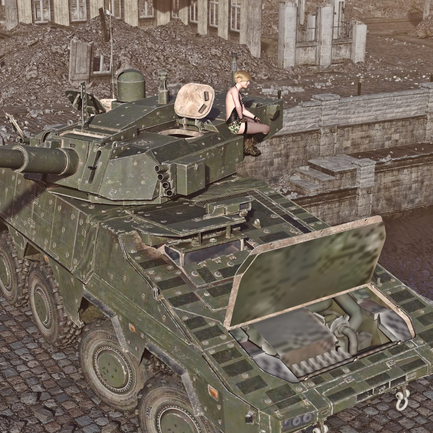 A cool armored vehicle for an efficient transportation of troops and providing fire support. Developed by and international group of companies, mainly produced in Germany. Hatches also can be open for dismount and easy access. Good for transportation and for combat with lightly armored enemies. You can also take your friends with you- it has some space. Has internals and rear space for troops. Turret and gun also rigged for good positioning. Converted and rigged for use in DAZ.