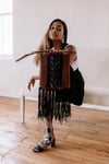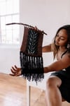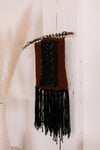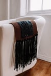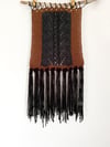 This wall hanging is worked in 3 colours and is worked from the bottom-up in rows. The garter stitch background is worked in one colour, the lacework is worked in a second, and the fringe is worked in a third. You will have 3 skeins of working yarn attached at once - two for the background and one for the lace. The transition from the background to the lace section is joined with the Intarsia join method.