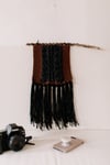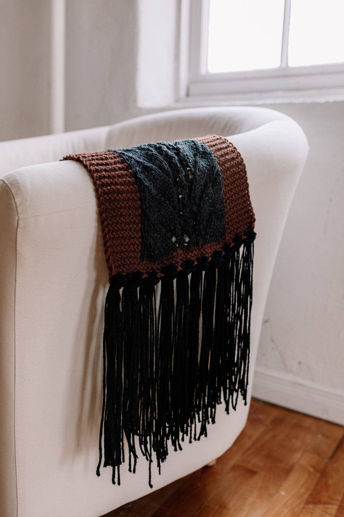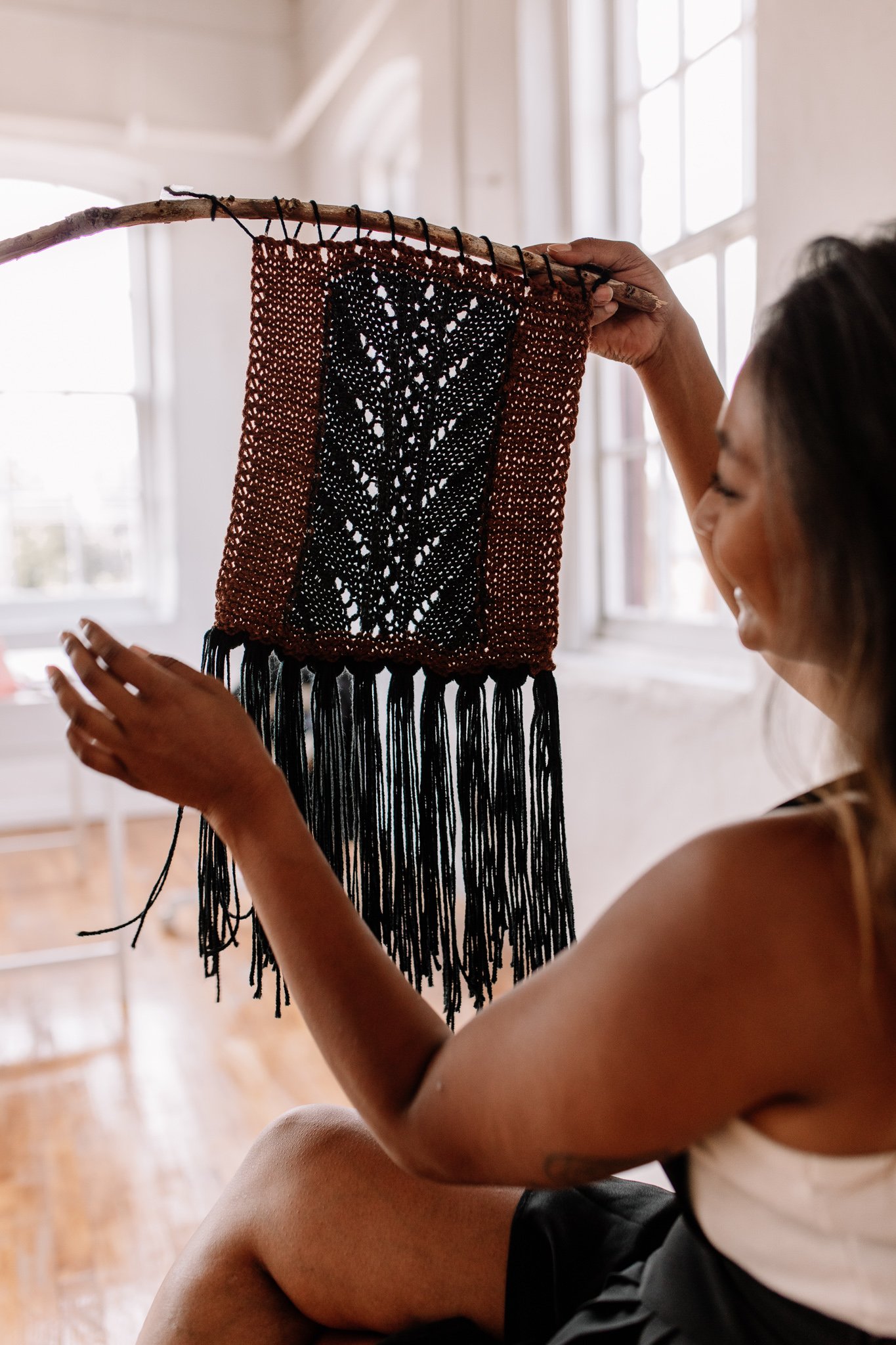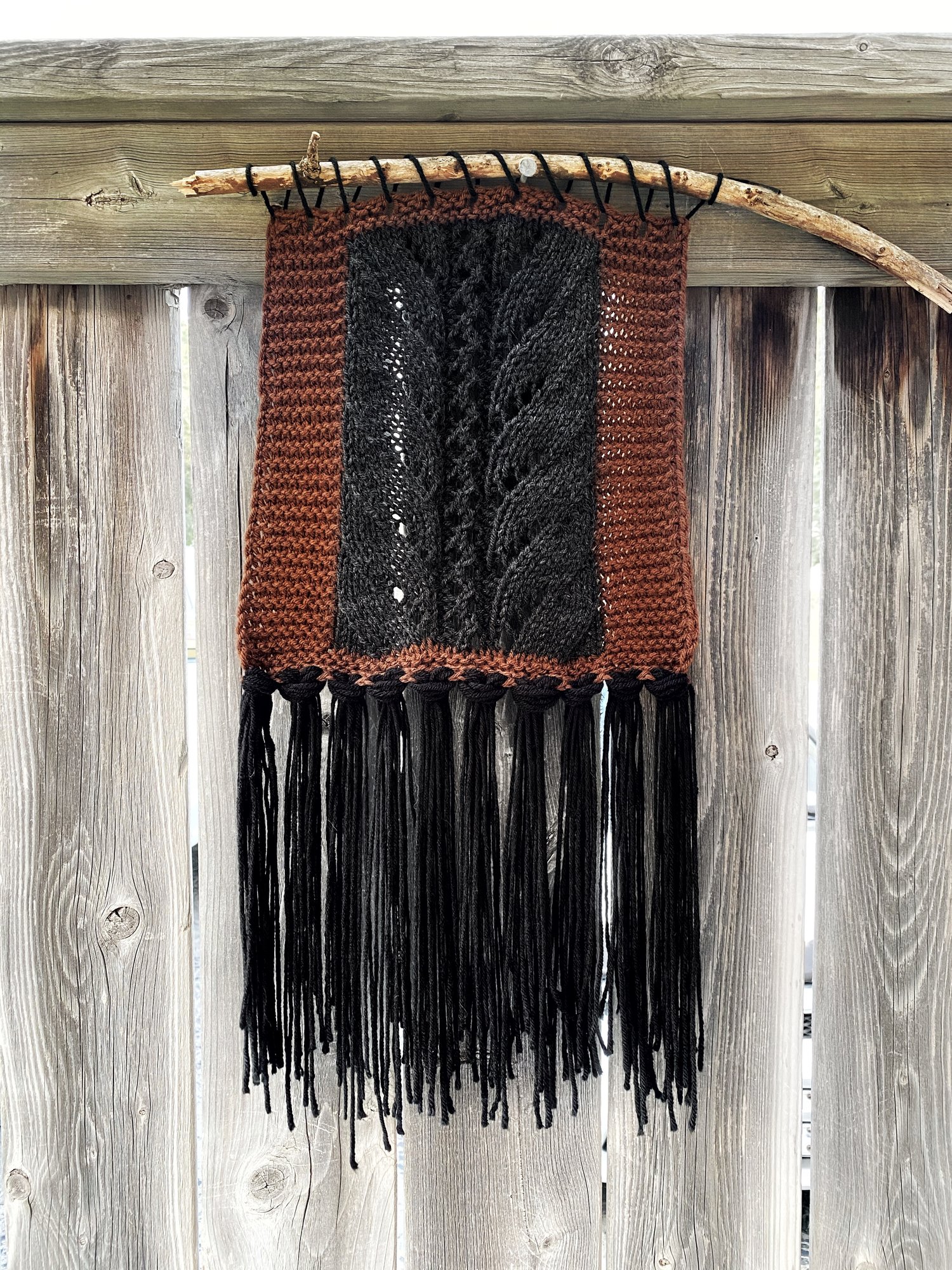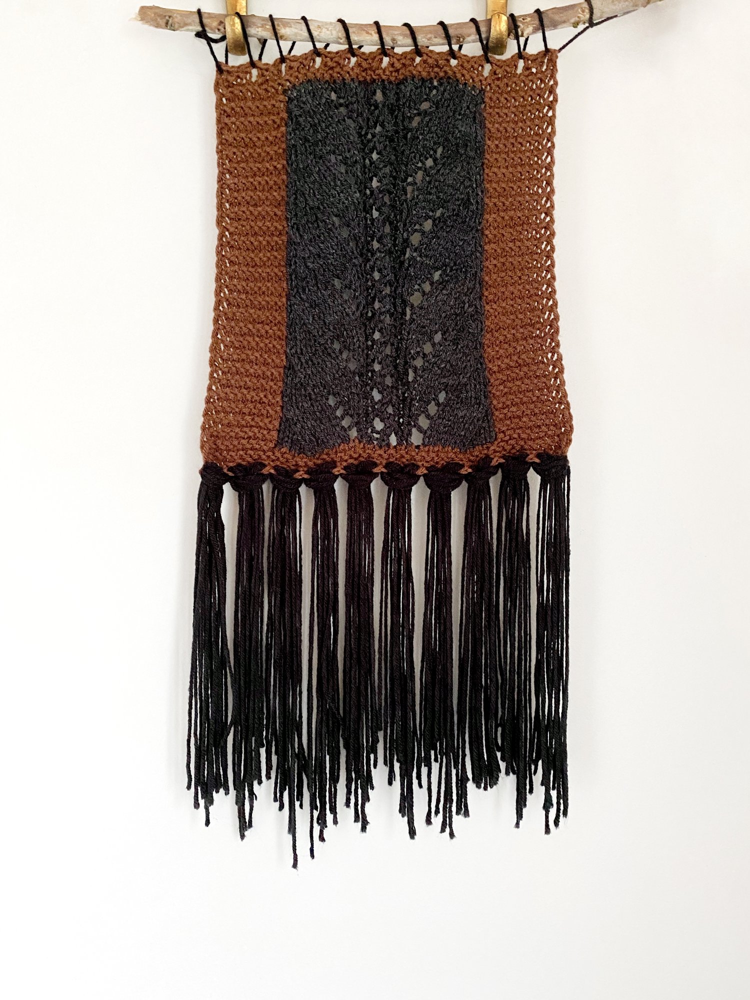 Rowan is a modern wall-hanging that incorporates knit lace-work and intarsia colour-blocking.