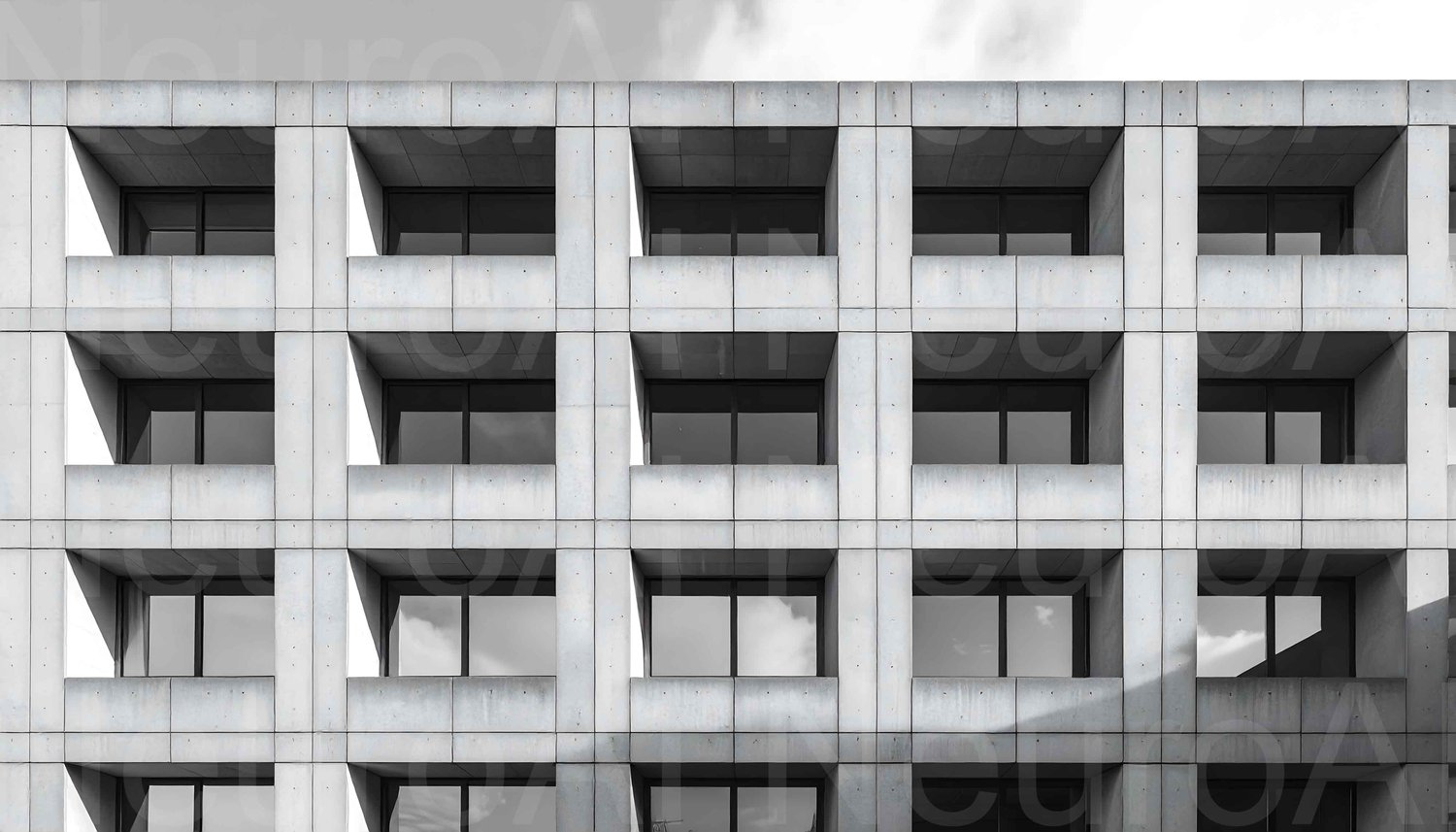 This black-and-white image showcases a modern building facade detail, highlighting the repeating geometric patterns of the windows and concrete structure. This image creates a sense of symmetry, order, and clarity, making it perfect for projects focused on architecture, urban design, or industrial design. Its monochromatic tone lends a professional and timeless touch.