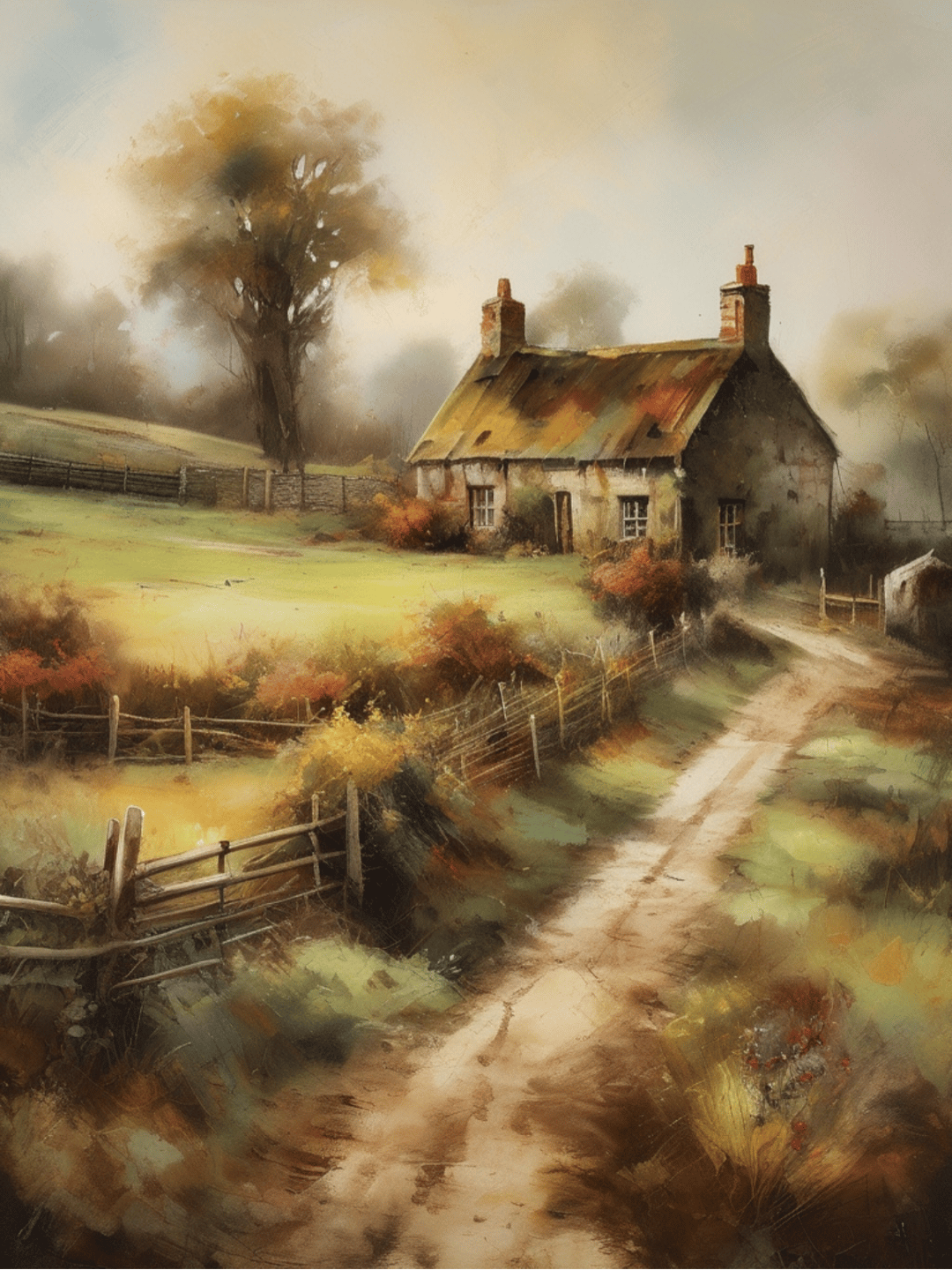 The old British countryside, a work of wall art dating back to 1960, with all its details and colours. The farm is an old oil painting in faded oil colours.png