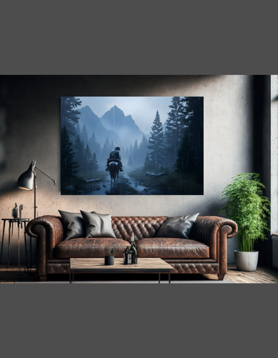 Atmospheric digital painting of a lone cowboy on horseback riding through a dark, rainy forest trail toward mountain peaks. Perfect for Rustic or Man Cave decor.