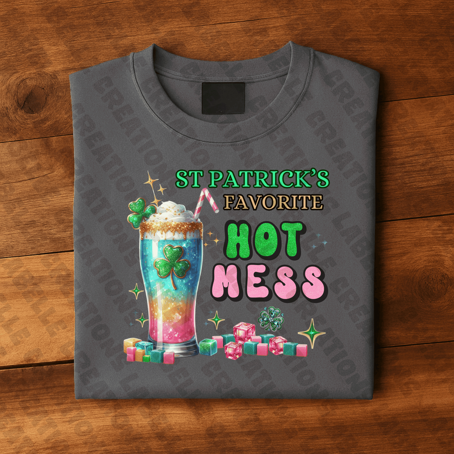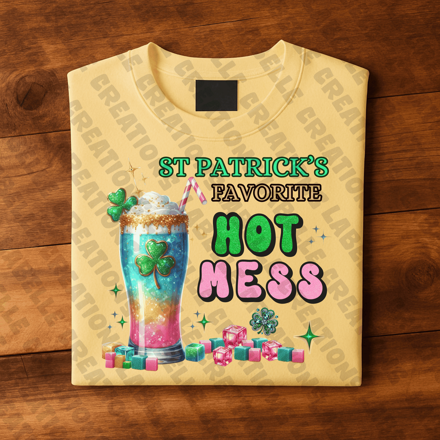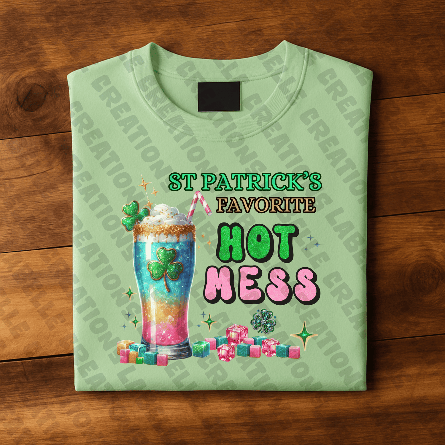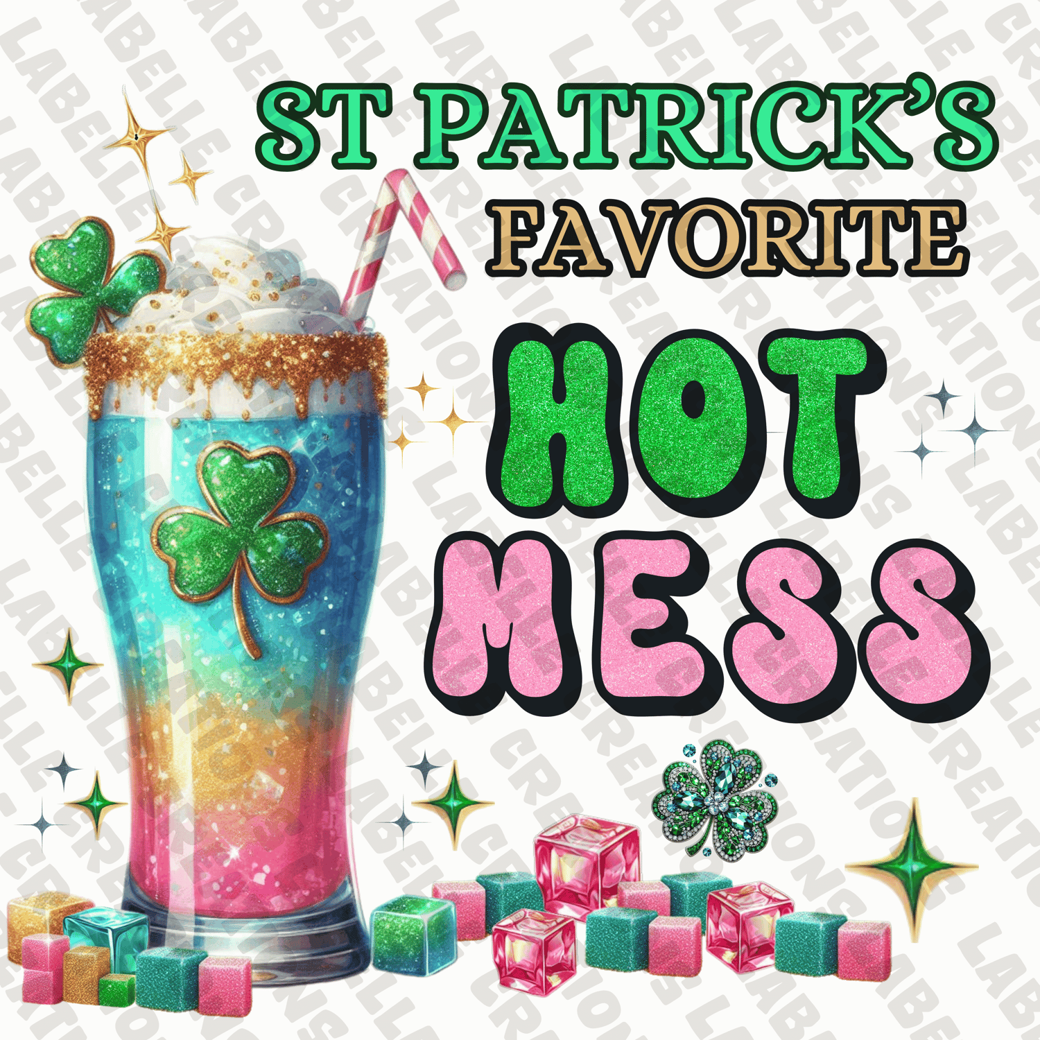 This original digital design features a vibrant, eye-catching St. Patrick’s Day theme centered around a colorful glitter drink topped with whipped cream, a striped straw, and sparkling gold accents. A bold shamrock detail on the glass pairs perfectly with the playful phrase “St. Patrick’s Favorite Hot Mess,” styled in bright green and pink glitter lettering for a fun, festive vibe.