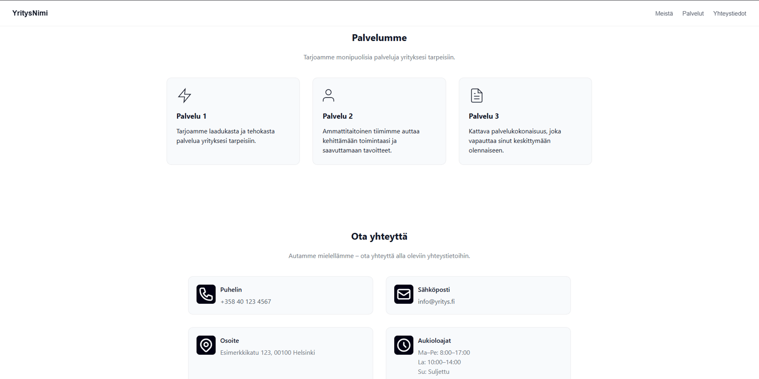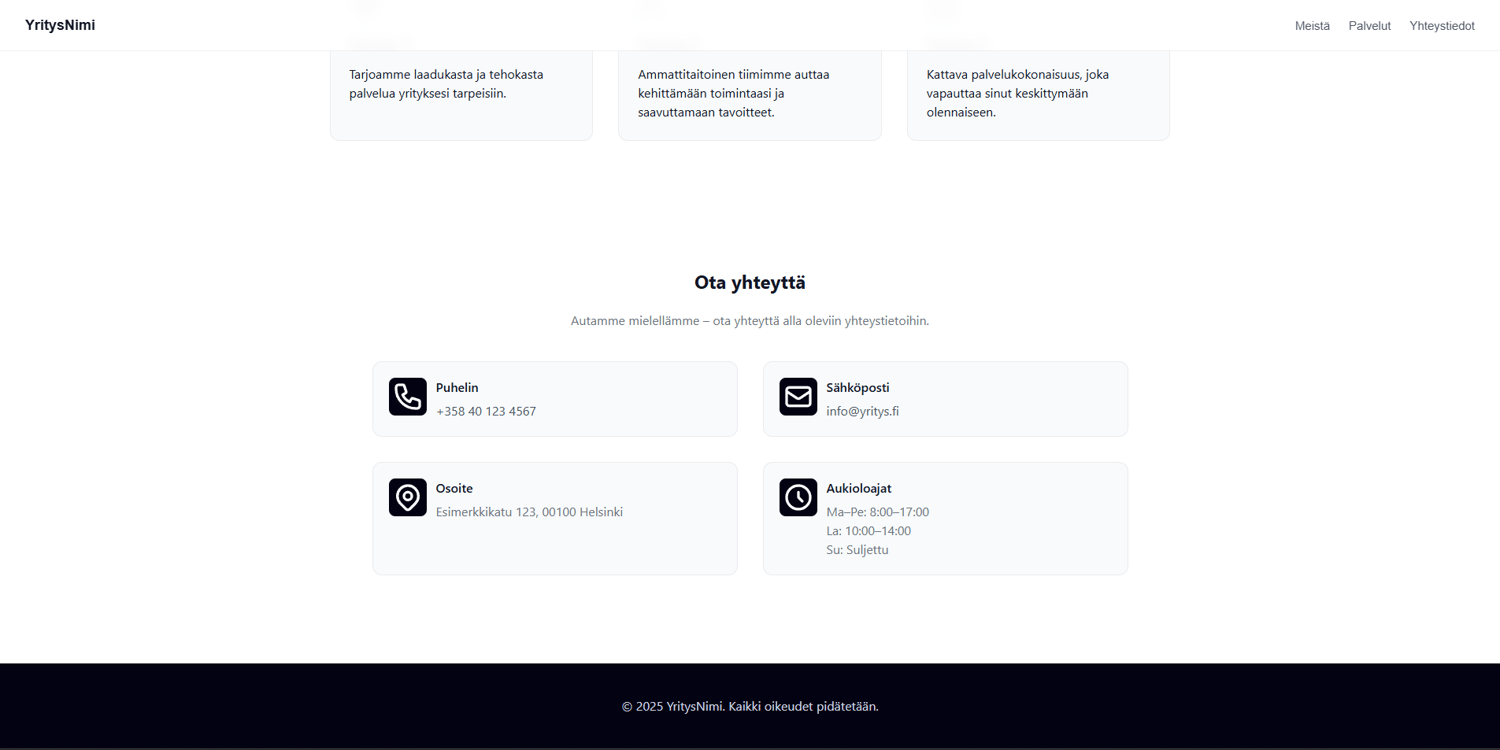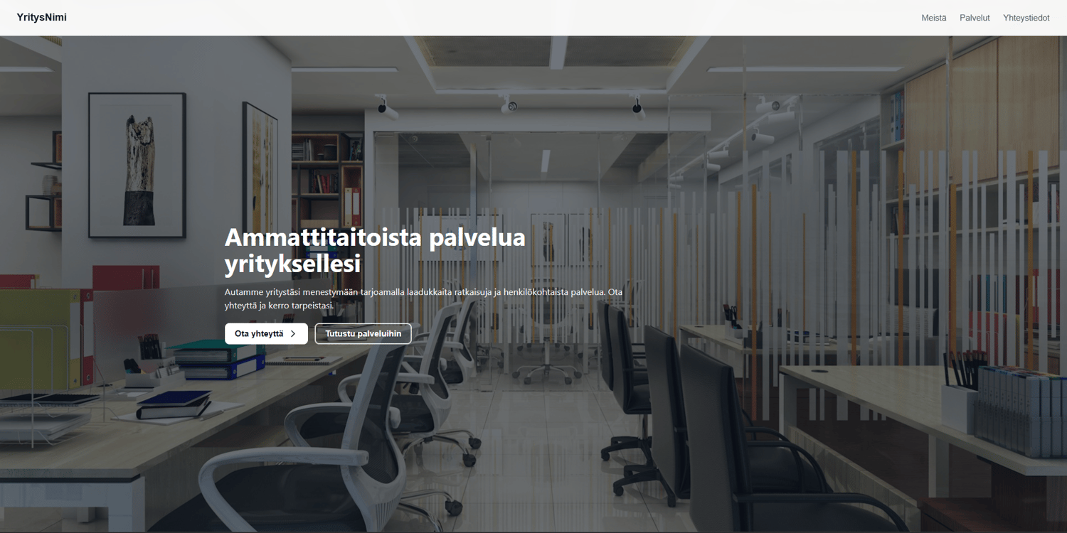 Täysin valmis HTML, CSS ja JS yrityssivupohja, joka on suunniteltu moderniksi, selkeäksi ja helposti muokattavaksi.
