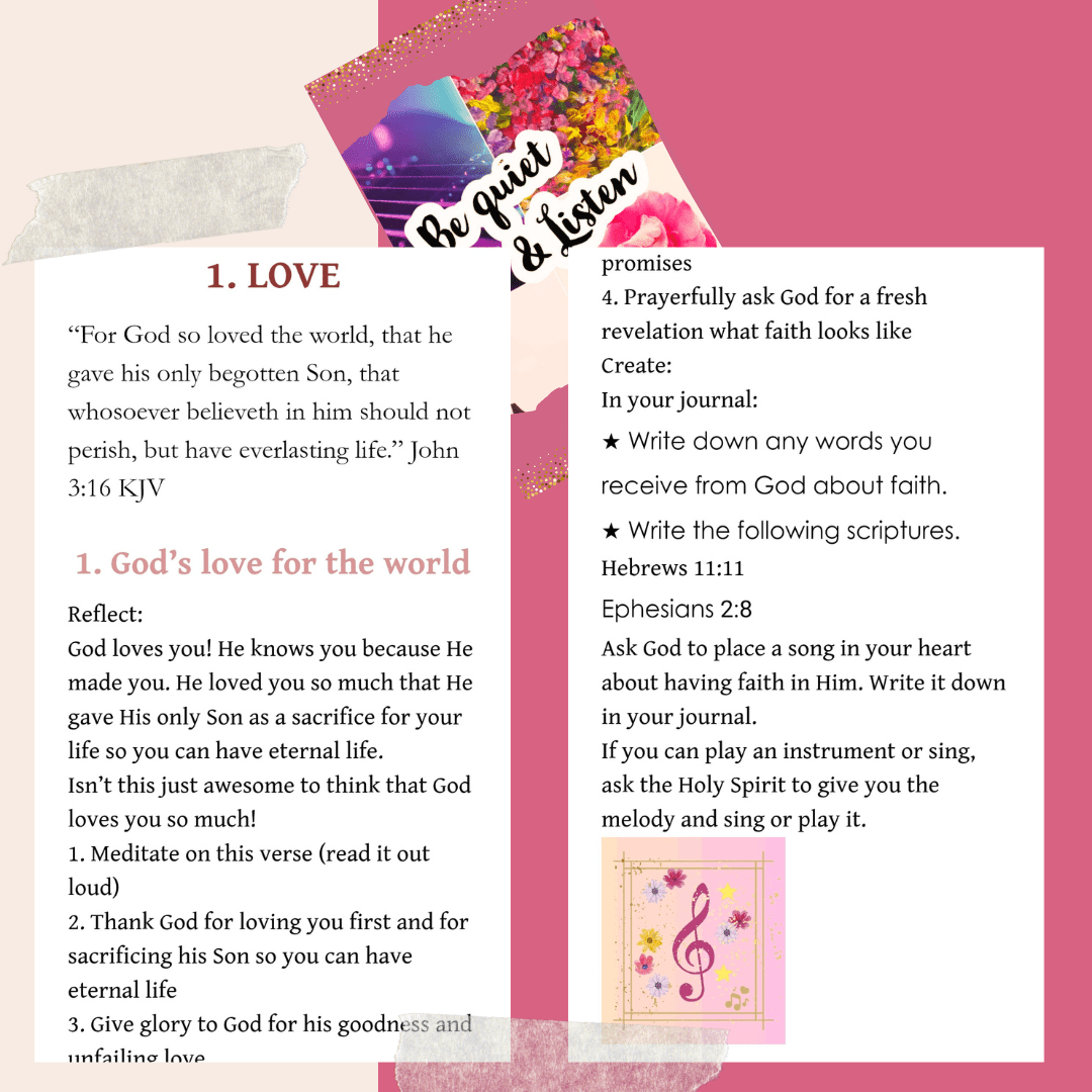 The Be Quiet and Listen Journal is a gentle invitation to step away from noise and distractions and intentionally draw closer to God. Created for believers who desire deeper intimacy with Christ, this journal helps you pause, reflect, pray and listen for His guidance in your daily life.