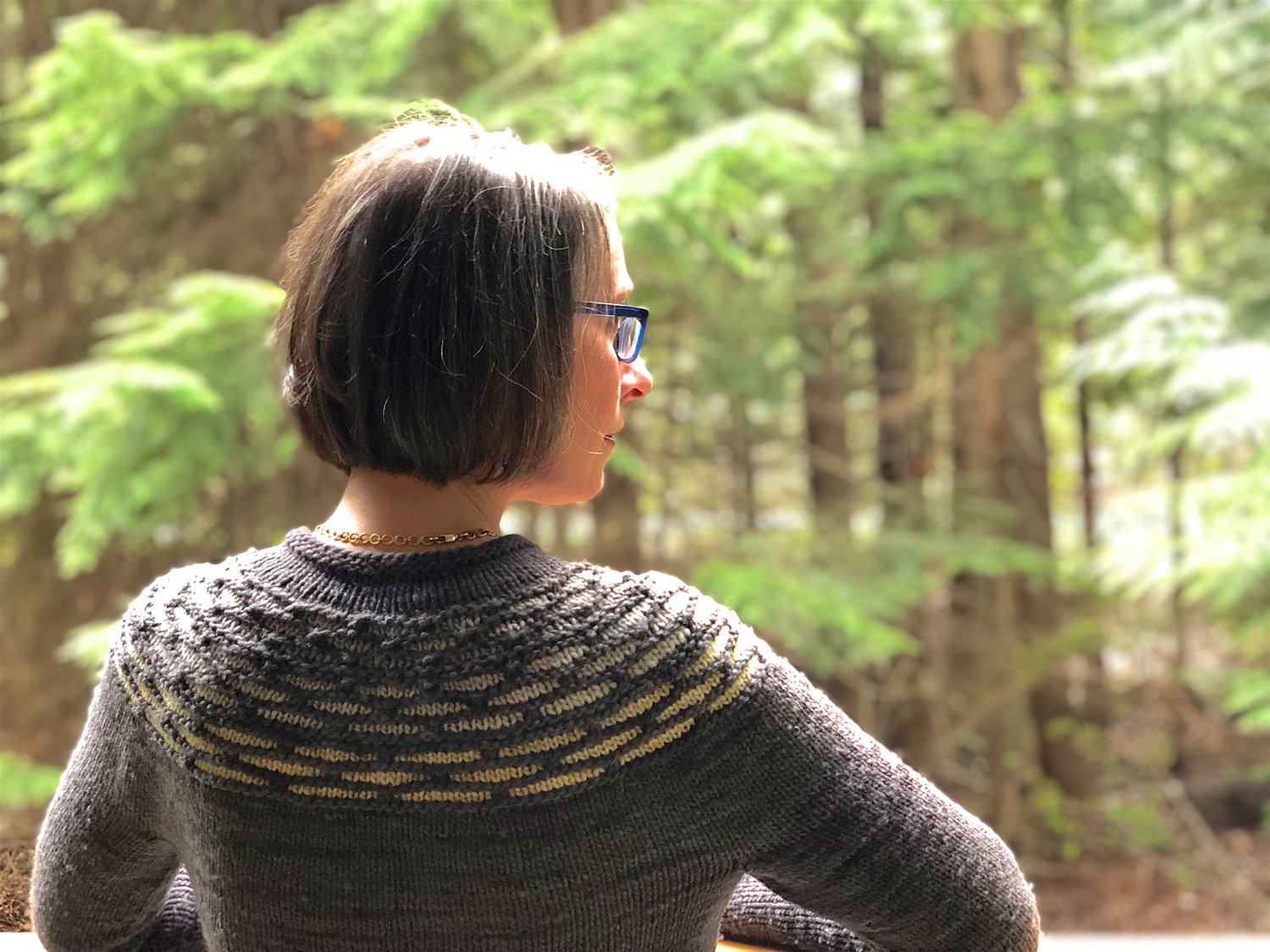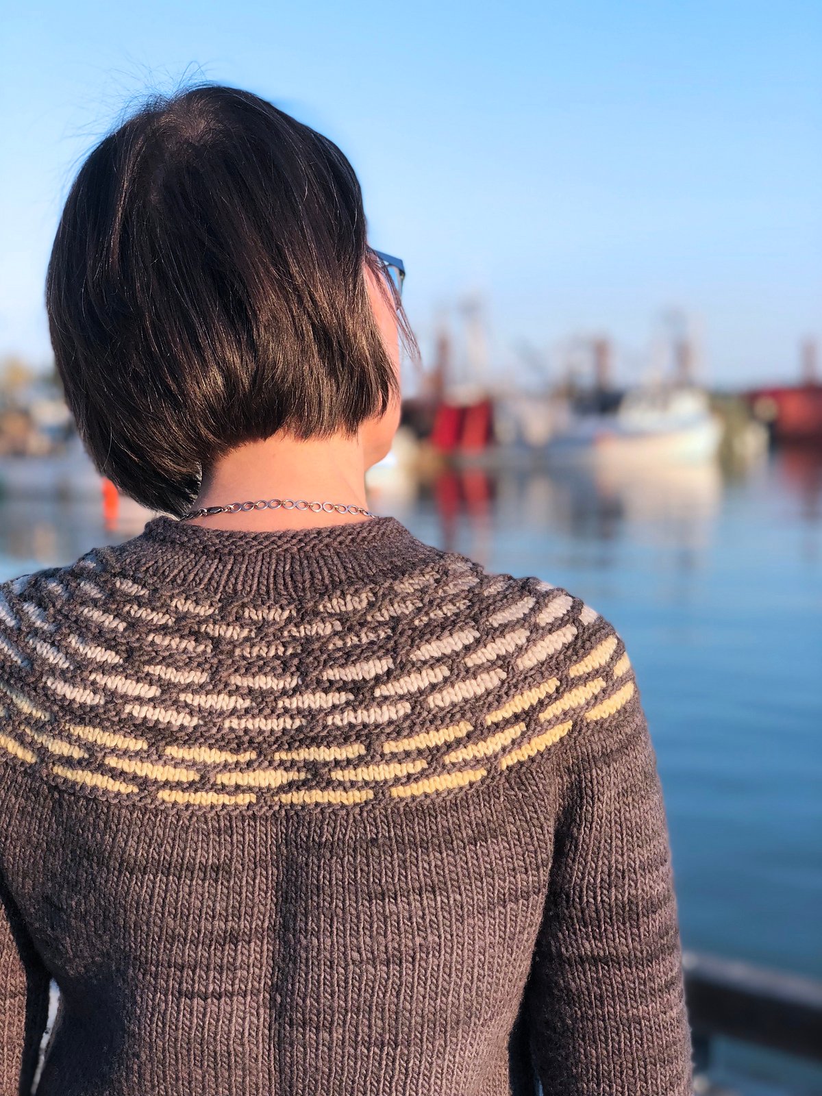 The contrasting colour in the yoke can be an ombre yarn, remnants from previous projects (solids or tonals) or a set of mini skeins. You could even hold two or three strands of fingering weight yarn together for those pops of colour. The original ombre yarn is a slow change of colour so I picked and chose which sections of the skein to use for each of the sets of tuck stitch motifs.