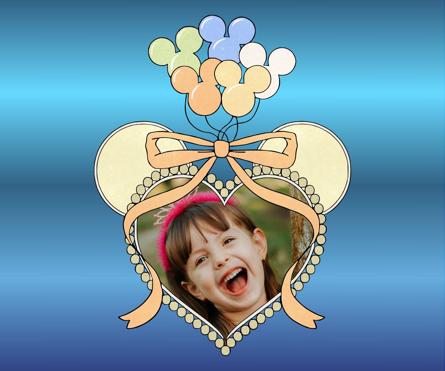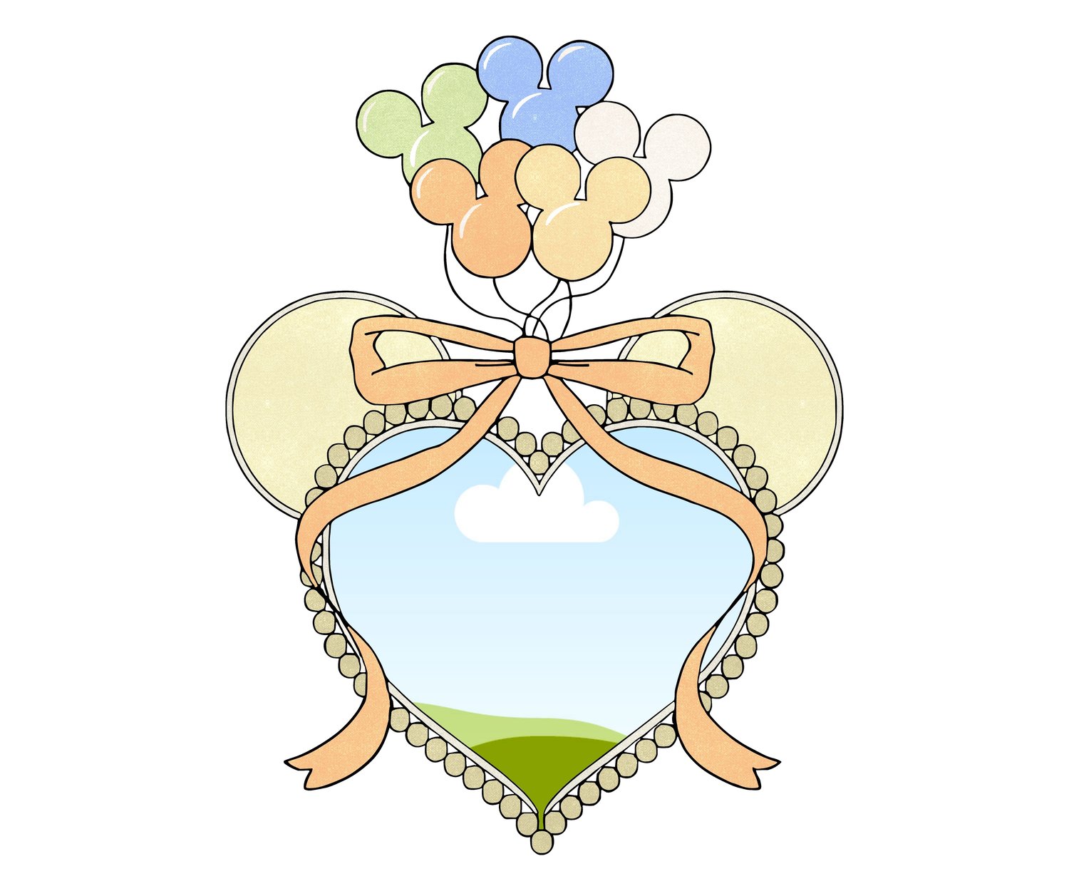 This adorable template features a heart-shaped photo frame adorned with delicate pearls and a sweet orange ribbon bow. Above the heart, a playful cluster of mouse-ear shaped balloons in soft pastel colors (green, blue, orange, cream) floats, topped with iconic character ears on either side of the heart.