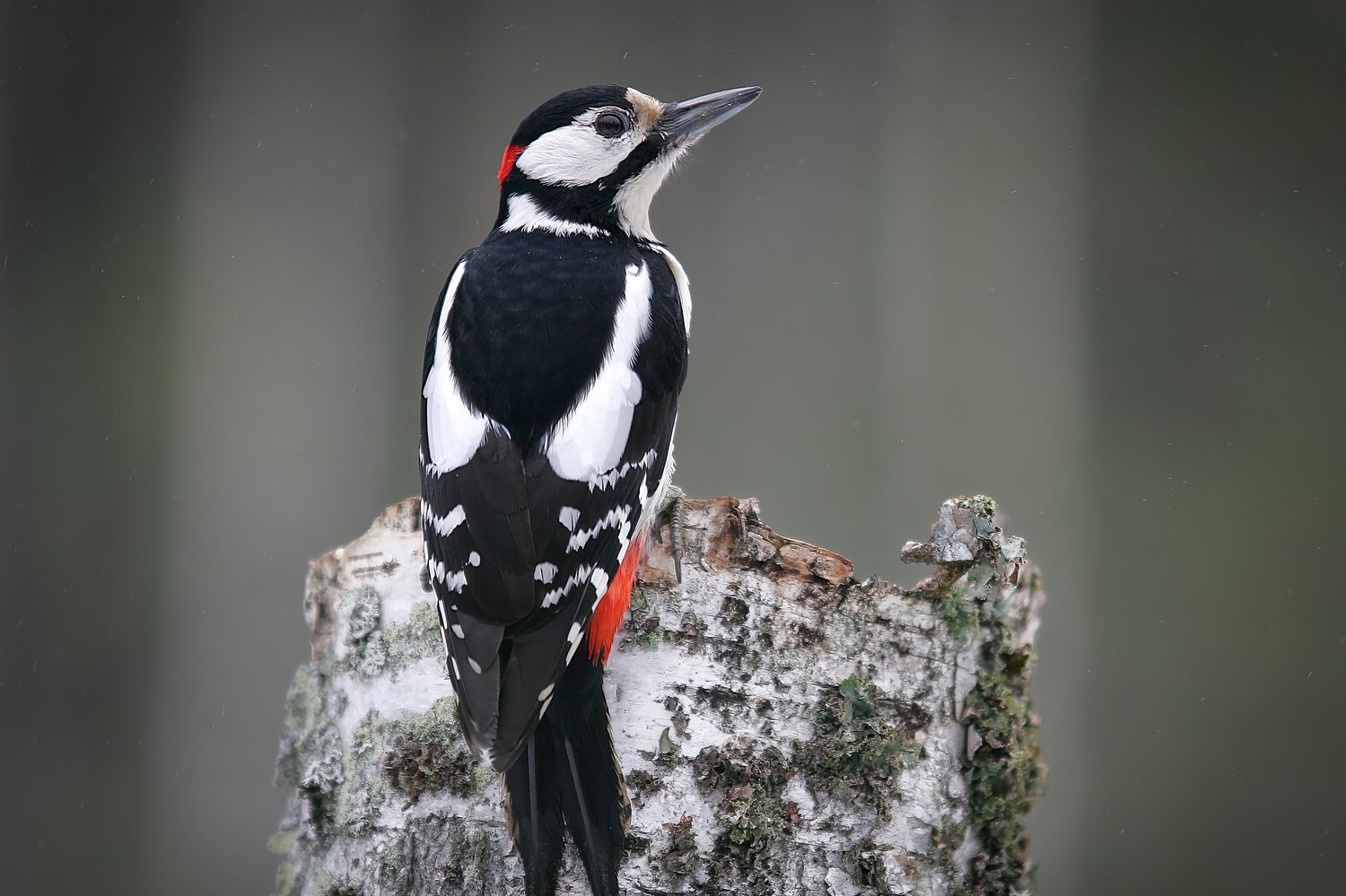 Great Spotted Woodpecker sitting on the birch stump.