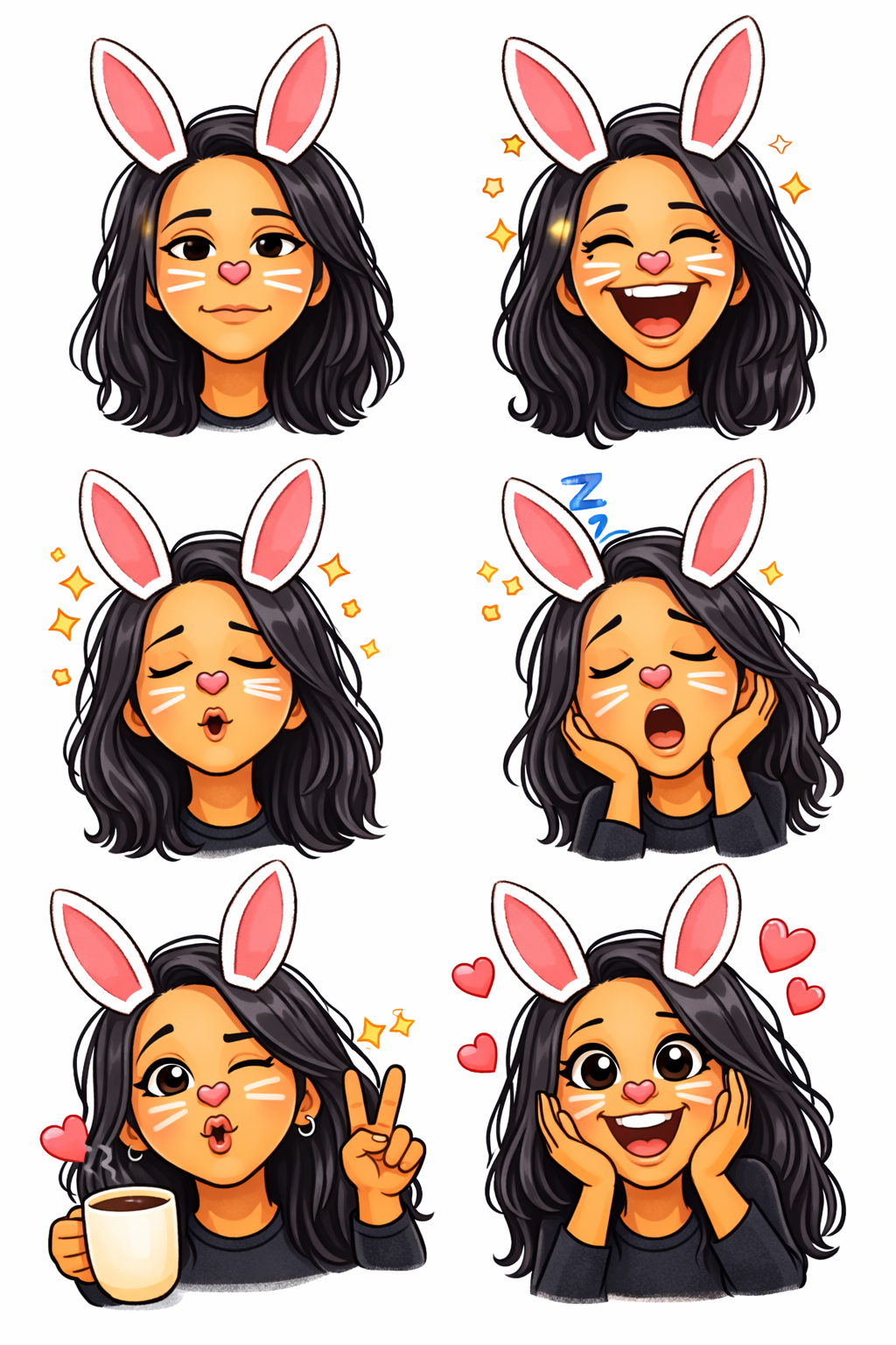 The Bunny Girl sticker pack features 6 adorable illustrated stickers of a dark-haired girl rocking her bunny ears in every mood β smiling, laughing, blowing kisses, sleepy, coffee mode and full of love! βπ