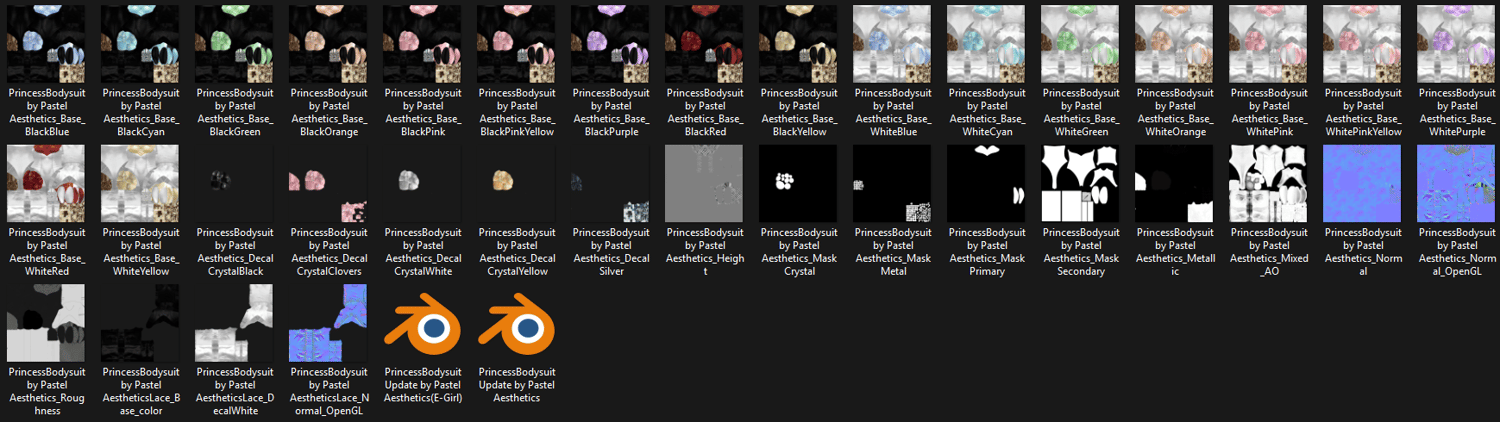 36 Textures (18 Base Colours, Height, Metallic, MixedAO, Normals, Roughness, Decals, Masks)