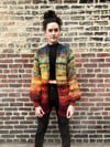 This open cardigan with bubble sleeves is worked from the bottom-up with no seaming. The marled, rainbow fabric is created by holding different yarns together and switching/swapping as you go.