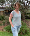 The V is a deep V. This can be shortened using additional edging rows/rounds. There are 3 V neck depths depending on size being made.