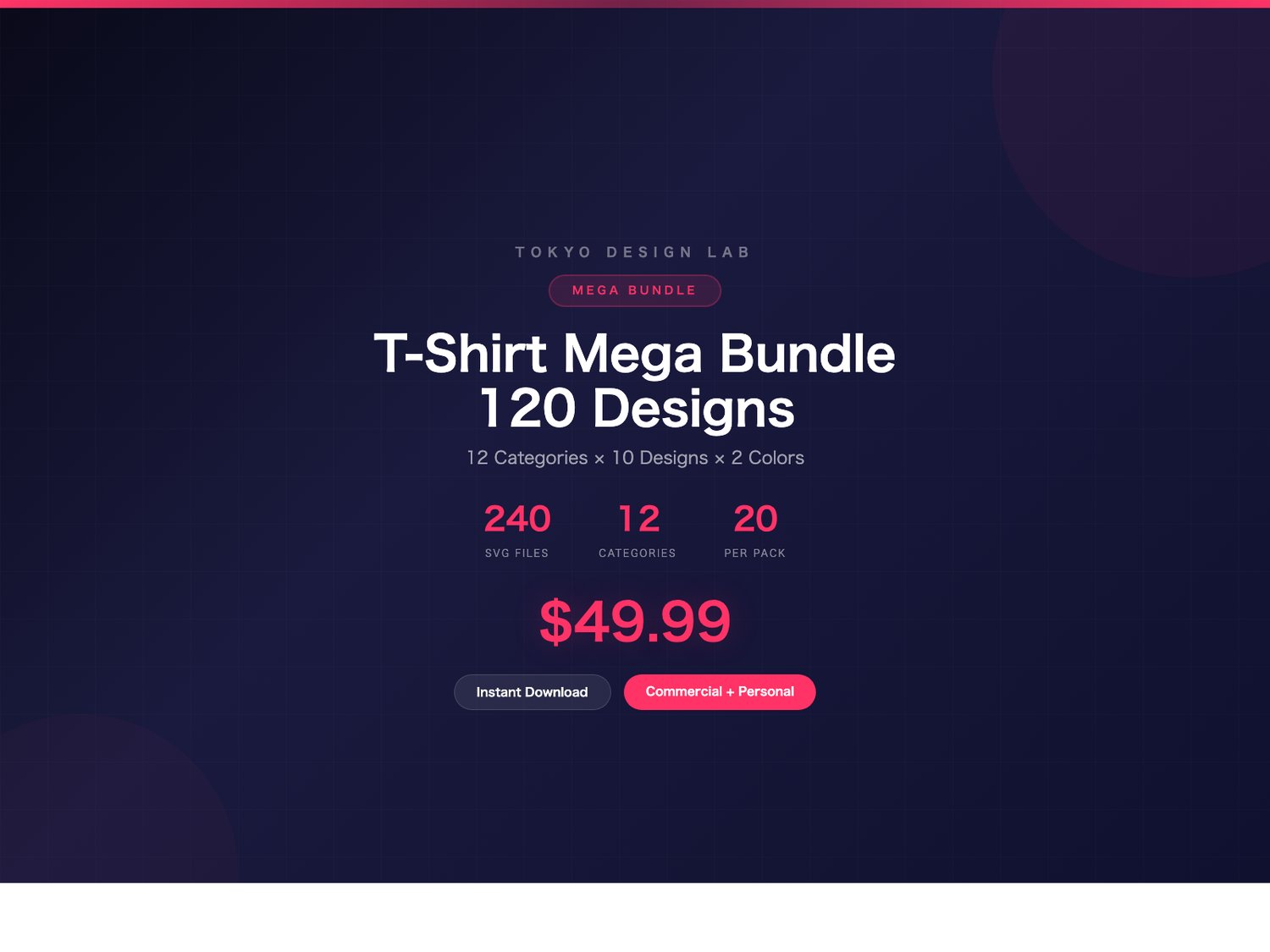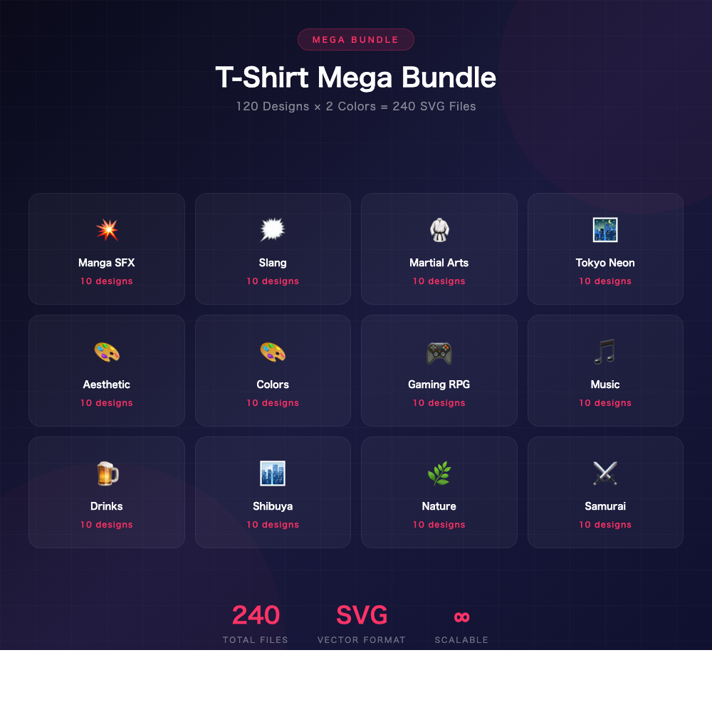 The ultimate Japanese t-shirt design collection! 12 themed packs with 10 designs each, all in 2 color variants = 240 SVG files total.