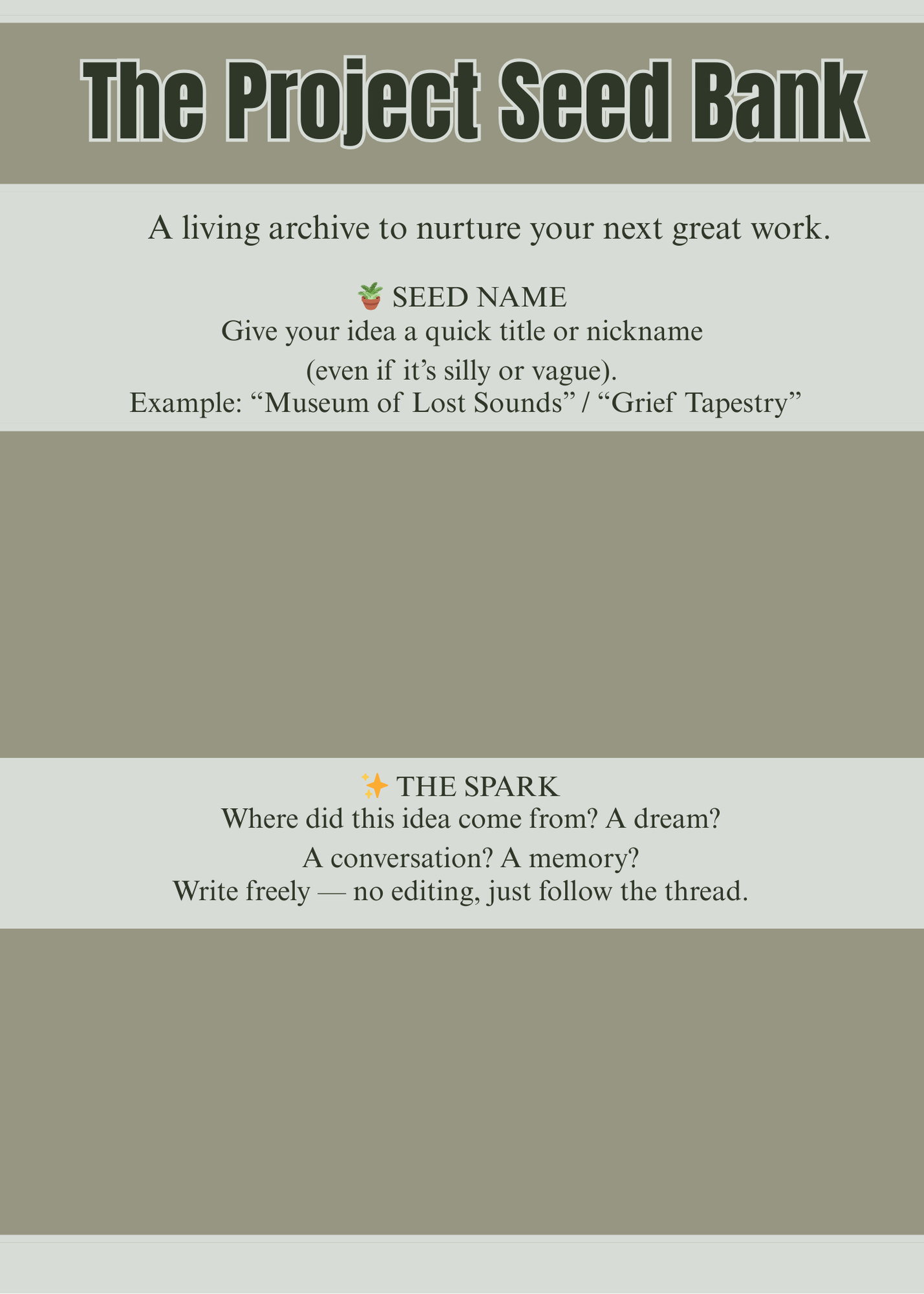 The Project Seed Bank is a creative container for capturing and cultivating your raw ideas, no matter how small, strange, or unfinished. It’s more than a brainstorm dump; it’s a living archive where inspiration is stored with intention.