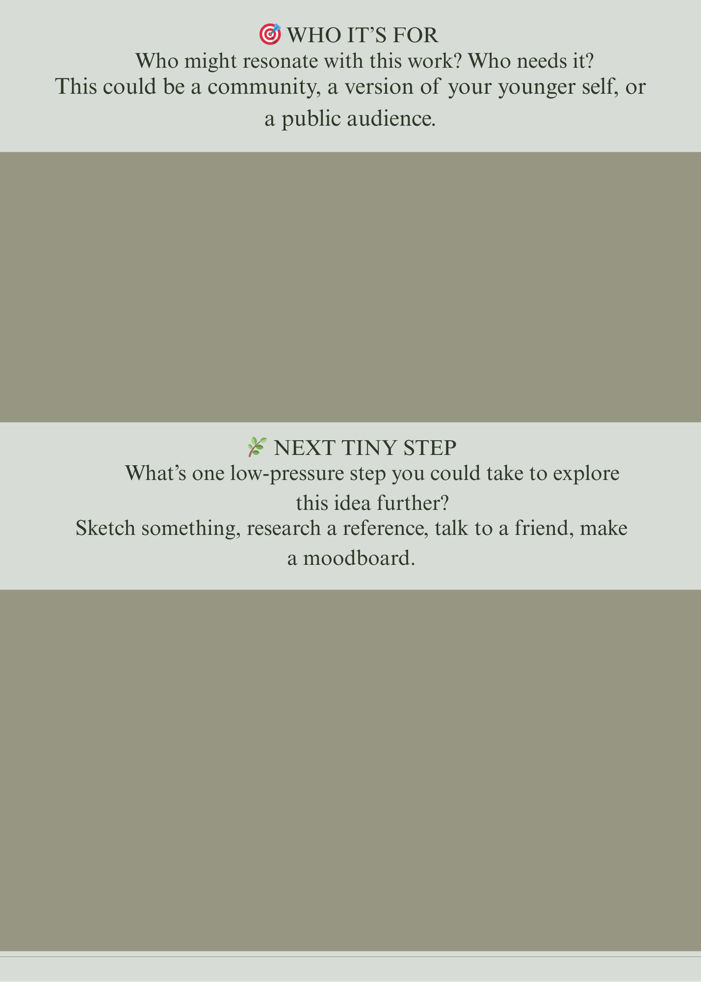 Inside, you’ll find structured yet flexible templates to help you explore each idea’s potential: Who is it for? What does it challenge? What form might it take? Over time, your scattered sparks become rooted visions that are ready to blossom into real, resonant work.