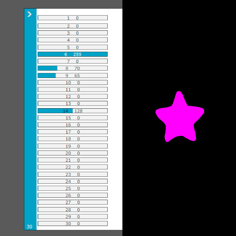 * Verifique que coincidan estos canales: 6 Dimmer, 8 en el valor 70 = Magenta, 9 en el valor 65 = Gobo de estrella, 14 foco (tercer foto).
