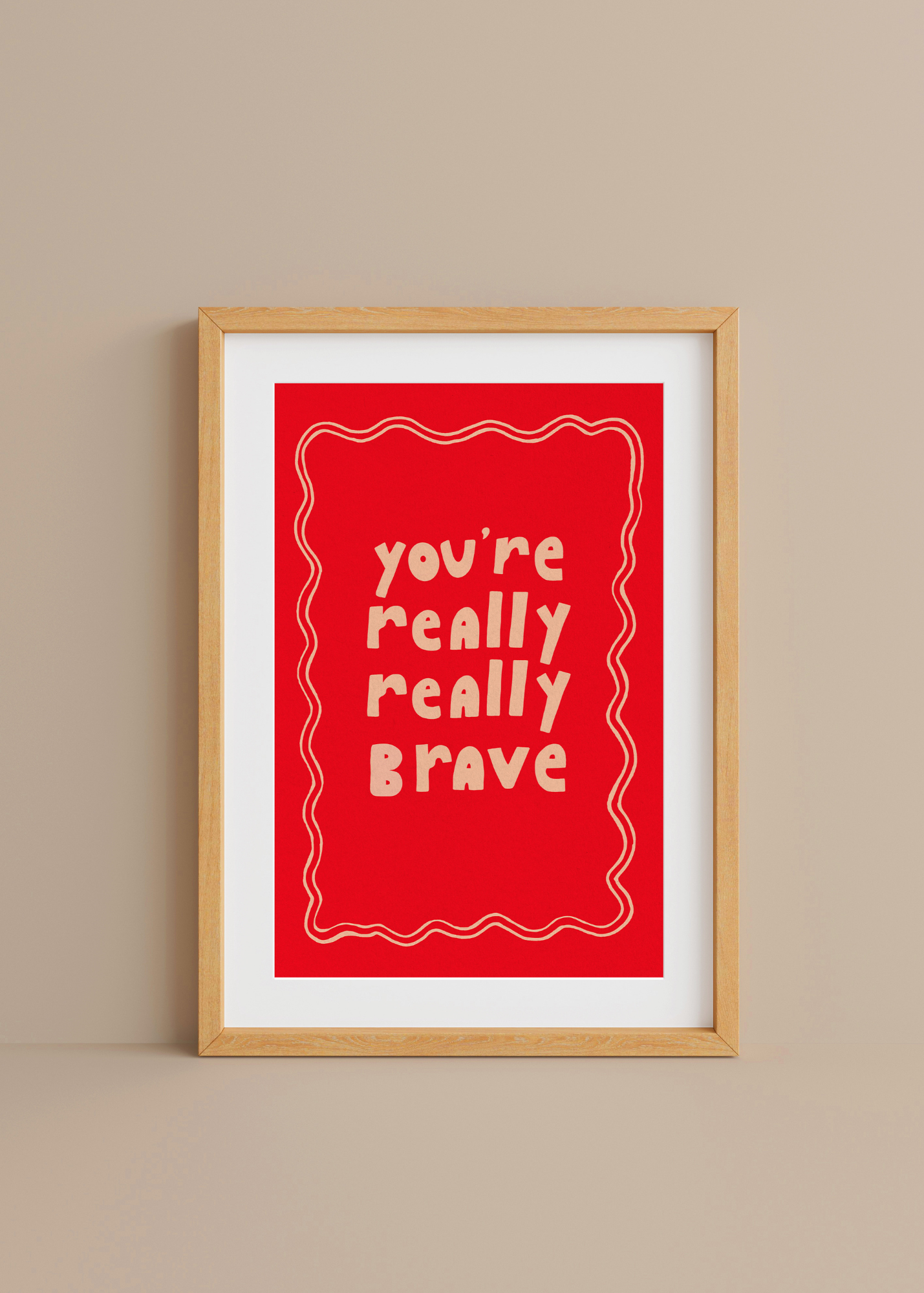 You're Really Brave— Set against a vivid red background, this piece speaks with quiet strength. A hand-drawn white frame loops softly around the words—you’re really, really brave—as if holding them in a steady breath. Bold, simple, and full of heart, it honors the kind of courage that isn’t loud but lasting. A reminder that bravery often looks like simply doing your best and continuing on.