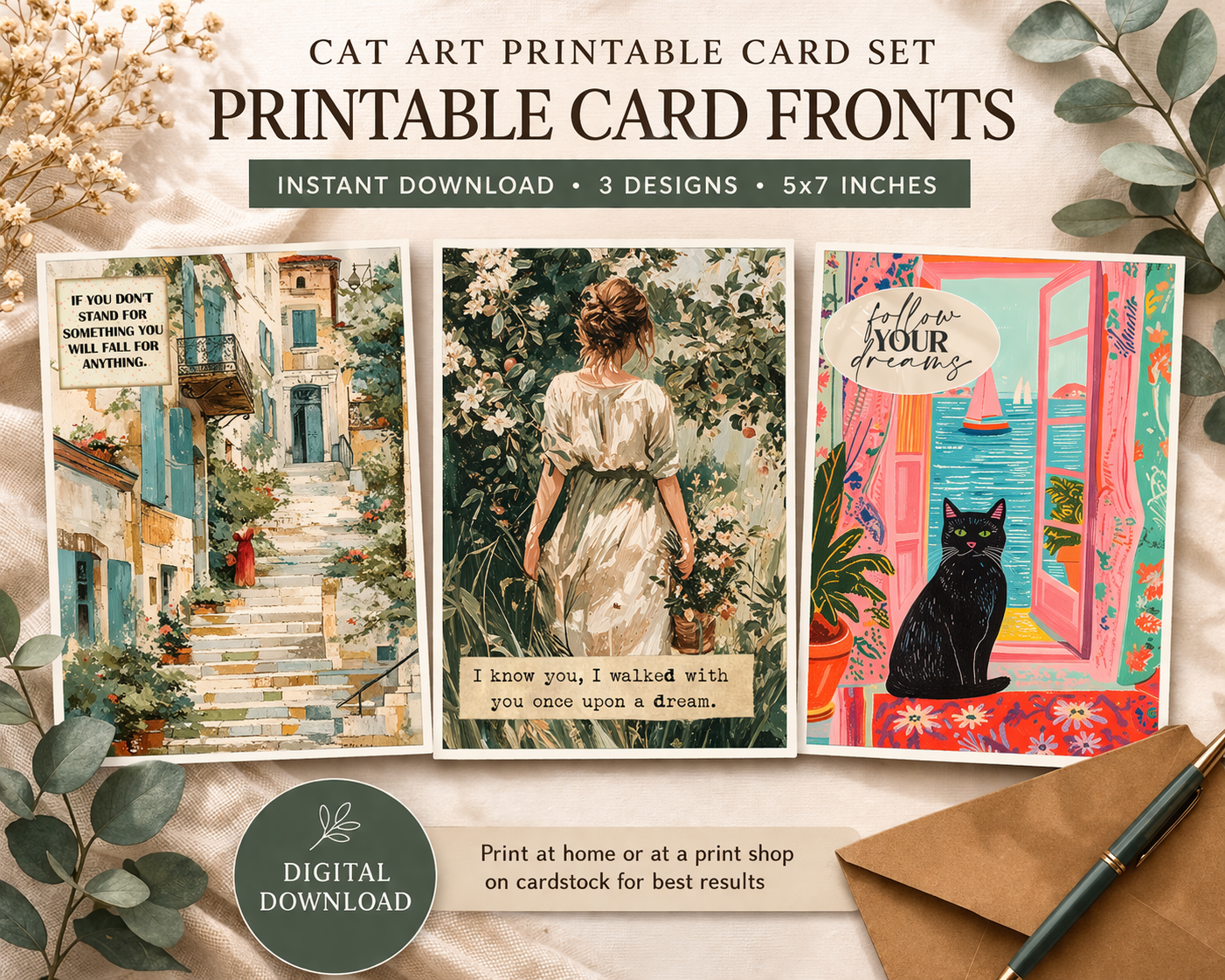 This charming set of three printable 5x7 card fronts features a beautiful mix of vintage-inspired artwork, soft painterly scenes, and uplifting messages. From a sunlit European street to a peaceful garden moment and a colorful coastal view, each design offers a unique and heartfelt way to connect with someone special.
