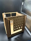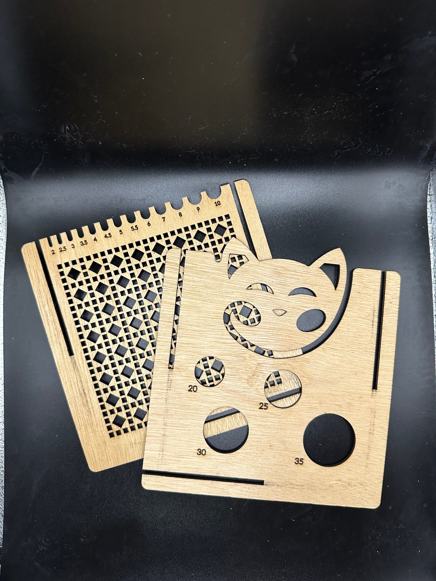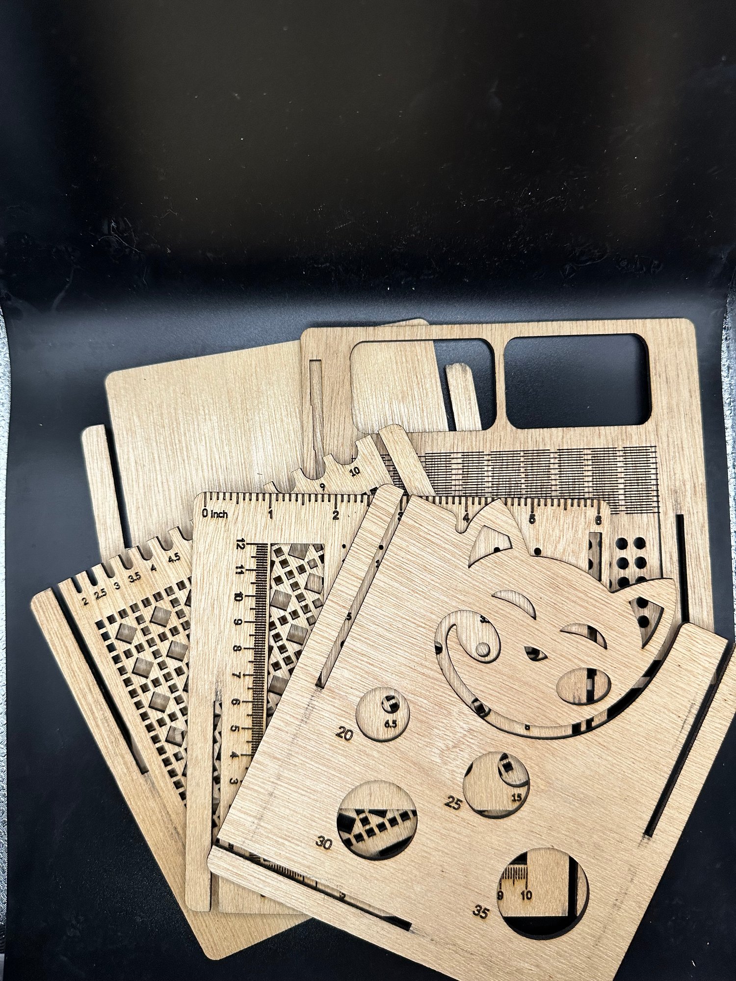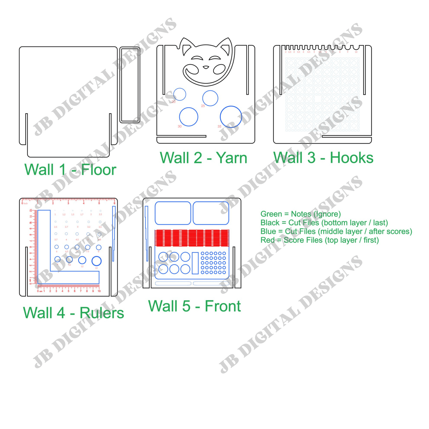 Design files for a laser cutter to make a yarn cube multi-tool organizer. The product is meant to be a yarn bowl, hook and needle holder and gauge, multiple rulers, stitch marker holder, and needle tray.