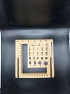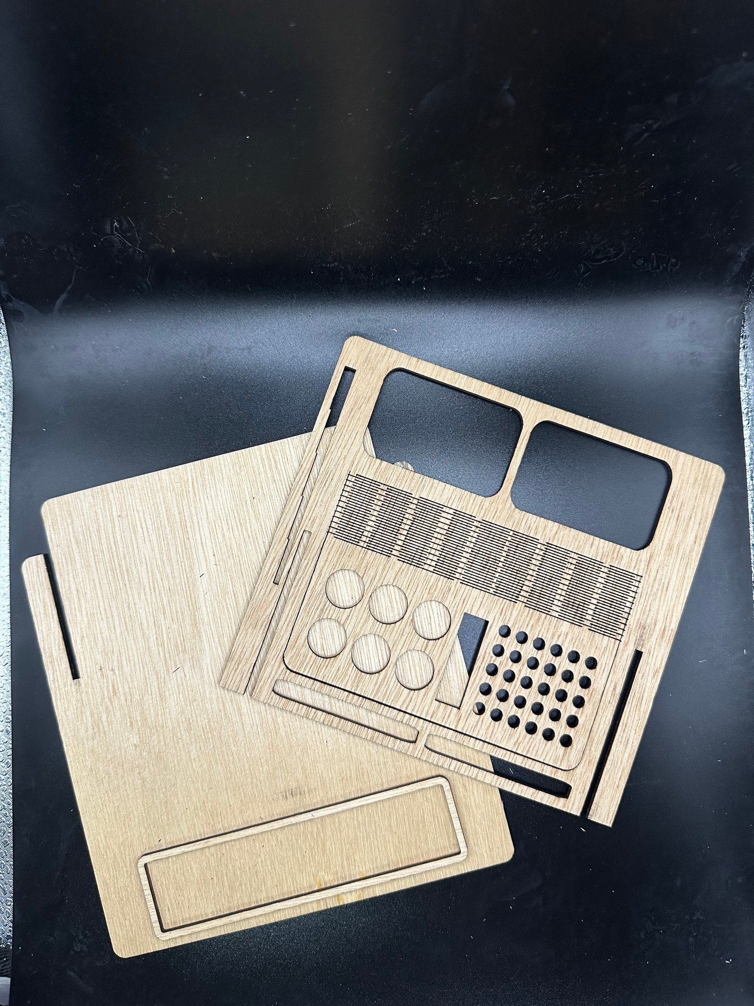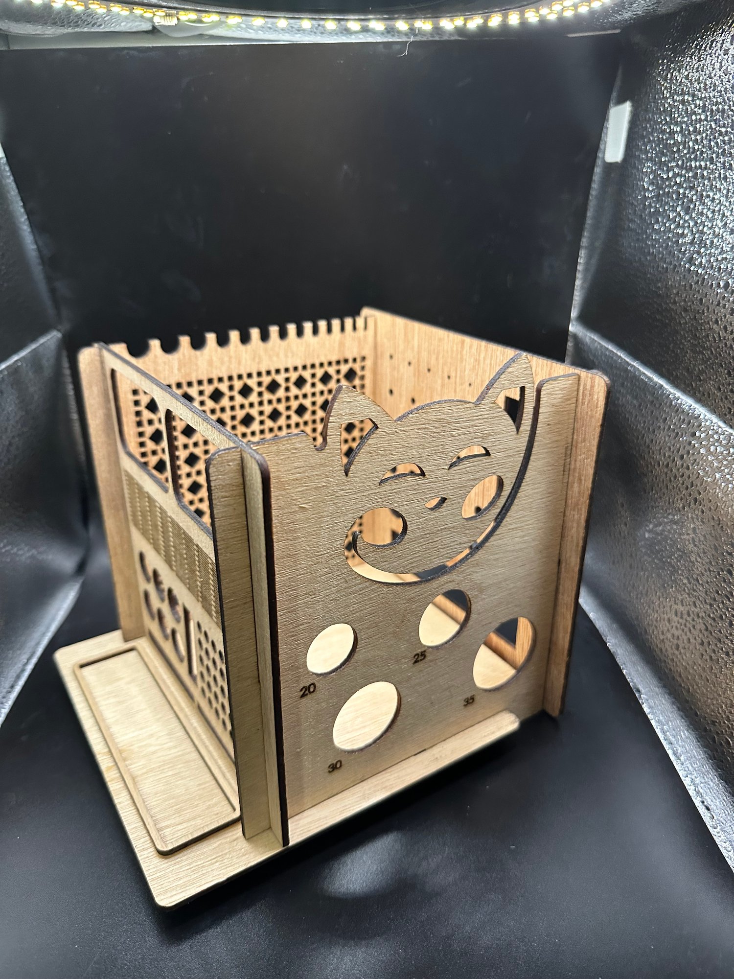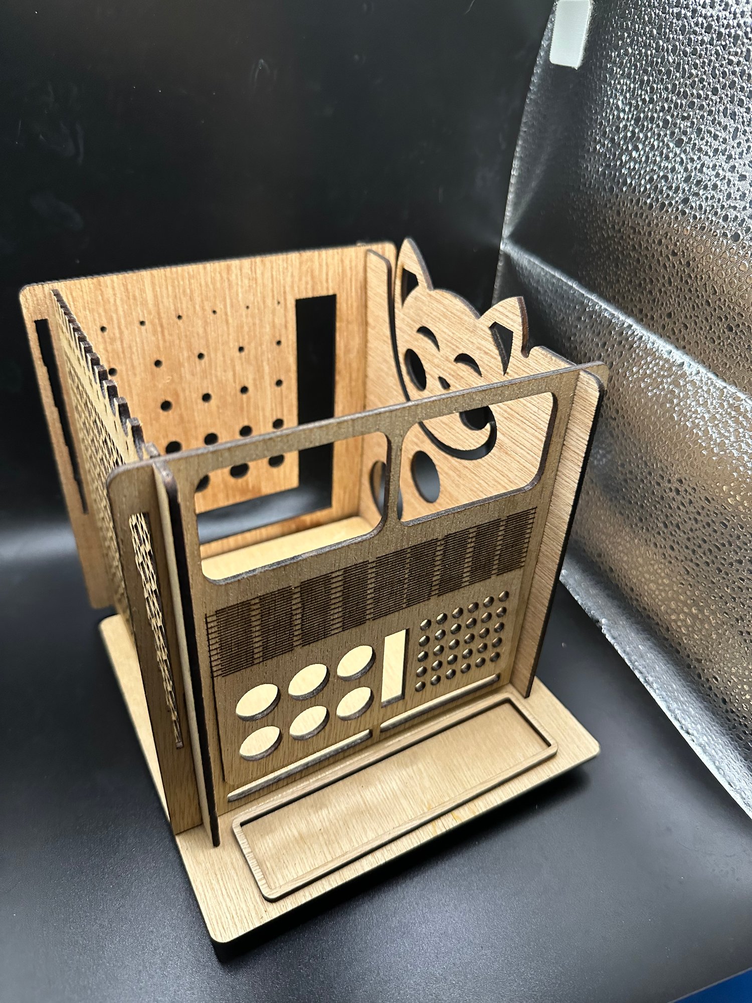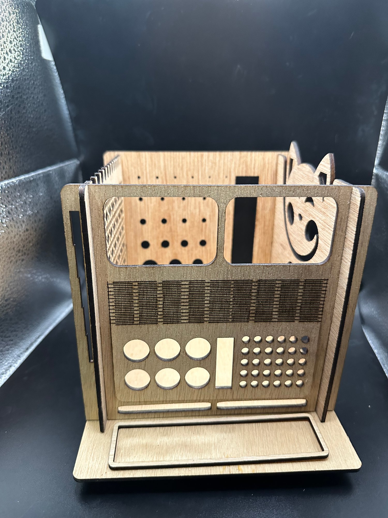 Design files for a laser cutter to make a yarn cube multi-tool organizer. The product is meant to be a yarn bowl, hook and needle holder and gauge, multiple rulers, stitch marker holder, and needle tray.