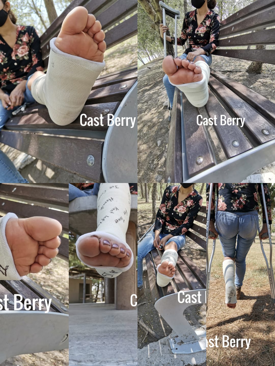 One of the first videos recorded, she is in a park with the cast, there are close-ups of her fingers, she uses crutches, the video is not full HD