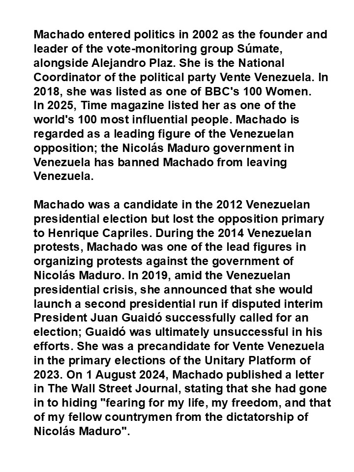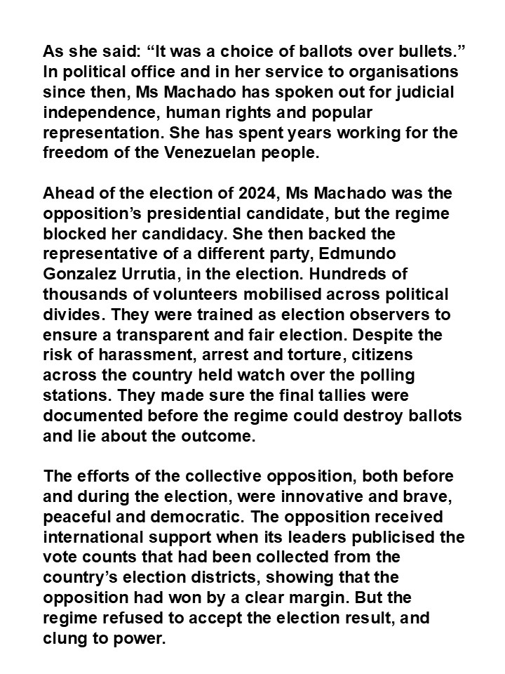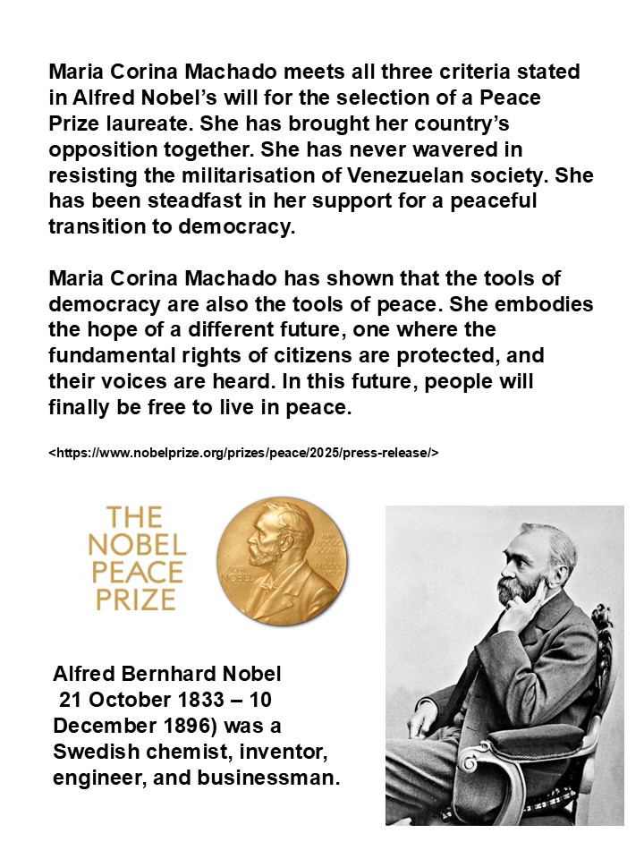 The Norwegian Nobel Committee has decided to award the Nobel Peace Prize for 2025 to Maria Corina Machado. The Nobel Peace Prize for 2025 goes to a brave and committed champion of peace – to a woman who keeps the flame of democracy burning amid a growing darkness. She is receiving the Nobel Peace Prize for her tireless work promoting democratic rights for the people of Venezuela and for her struggle to achieve a just and peaceful transition from dictatorship to democracy.