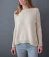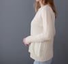 Rhilea Sweater ist ein modern geschnittener Pullover mit einem einfachen Lochmuster am Rücken. Dazu gibt es ein zusätzliches Detail am Rücken und bei den Armen (siehe Fotos). Der Pullover wird nahtlos von oben nach unten gestrickt.