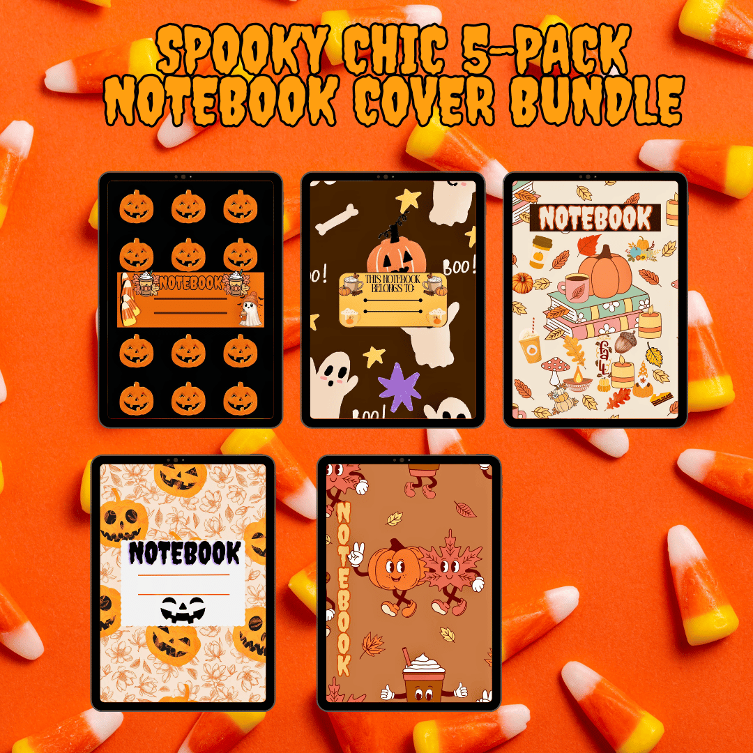Embrace the cozy vibes of fall and the playful spookiness of Halloween with our Spooky Chic 5-pack notebook cover bundle! This set features five unique digital covers, each adorned with charming autumn motifs—from pumpkins and fall leaves to whimsical Halloween patterns. Whether you’re jotting down seasonal plans, spooky stories, or fall to-do lists, these covers will add a festive flair to your digital notebooks.